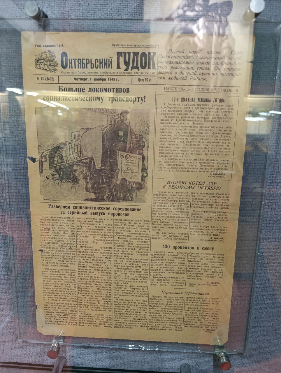 Внушительный портрет основателя завода Густава Гартмана и рядом - монументальный бюст первого красного директора Ивана Шмырова, детский велосипед, созданный на заводе тепловозостроителей, скромный пиджак легендарного директора Павла Сороки, заводская газета «Октябрьский гудок» 1945 года, напоминание о досрочно выполненной пятилетке, которой щелкнули по носу иностранных злопыхателей, и книга с добрыми словами от гостей из Британии, наконец, впечатляющие макеты гигантов, которые когда-то выпускались на нашем заводе и которые тоже собраны руками заводчан.