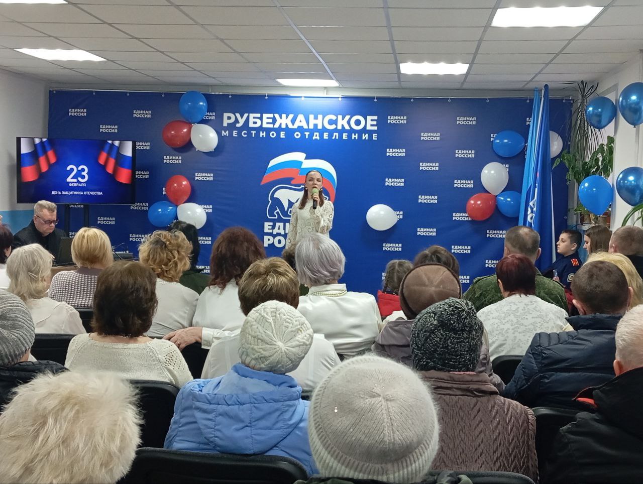 С приветственной речью выступил Секретарь Рубежанского местного отделения ВПП «Единая Россия» и поздравил собравшихся с наступающим праздником. Затем своими песнями собравшихся порадовали хор «Рубежанские зори» и артисты из ГБУДО «Звезда».