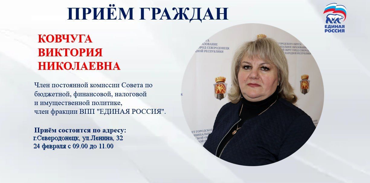 24 февраля с 09.00 до11.00 прием граждан проведет депутат Совета городского округа город Северодонецк Ковчуга Виктория Николаевна - член постоянной комиссии Совета по бюджетной, финансовой, налоговой и имущественной политике, член фракции ВПП "ЕДИНАЯ РОССИЯ".