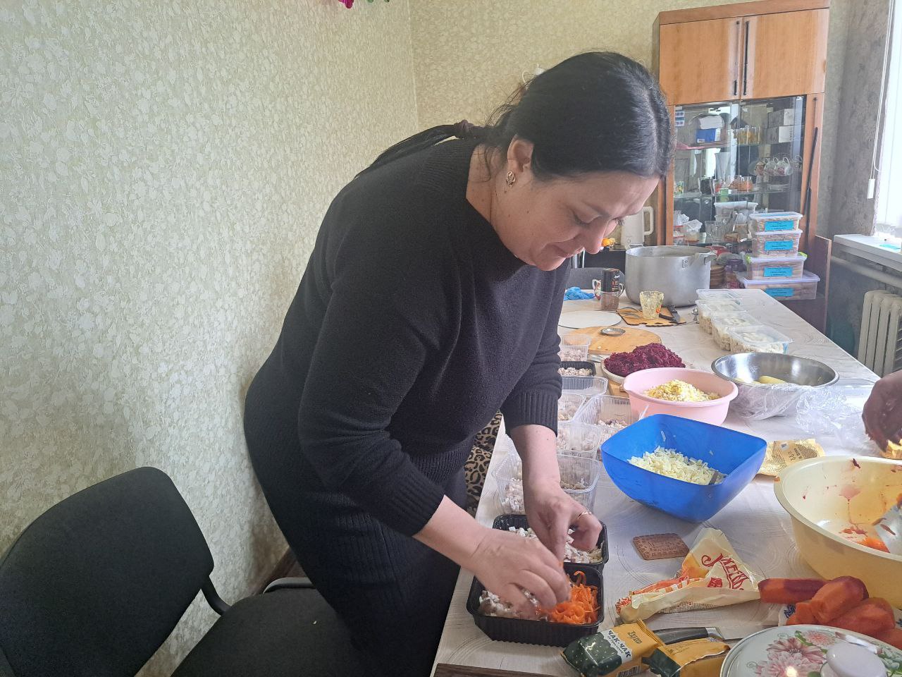Заботливые хозяюшки приготовили для ребят вкусные посылки: 260 блинов с разнообразными начинками, 70 ароматных пирожков, 15 килограммов разнообразных салатов.