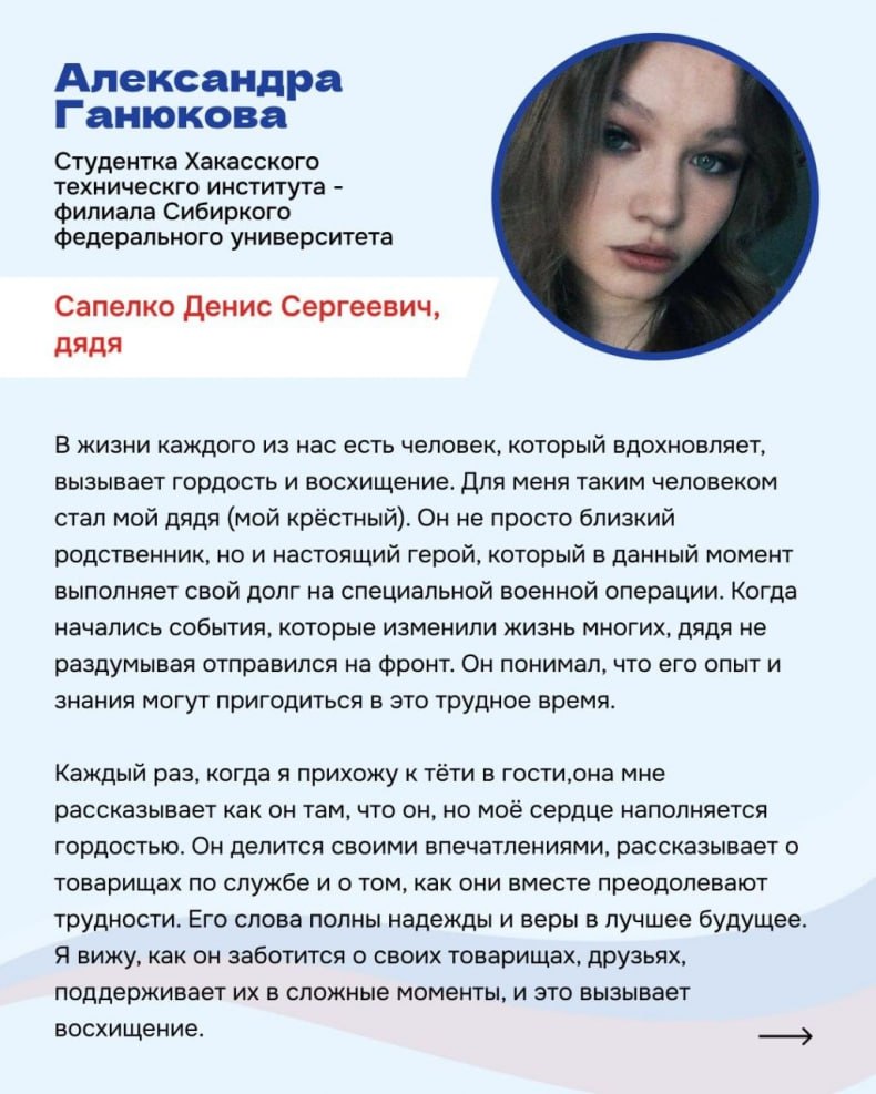 Студенты образовательных организаций Хакасии и ЛНР рассказали о прадедах-фронтовиках, награждённых боевыми орденами, о родных, которые сегодня выполняют свой воинский долг, о тех, кто своим трудом и мужеством укрепляет страну. Каждая история — это личная благодарность, память и гордость за своих героев.