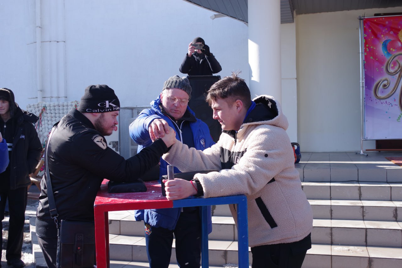 Гостей ждала насыщенная театрализованная программа. Веселые персонажи в ярких костюмах — Масленица, Скоморох и Бабушка-Ёжка — вели праздник, вовлекая всех в игры и конкурсы. Дети и взрослые соревновались в ловкости: поднимали гири, пилили бревно и участвовали в эстафетах. Особый восторг вызвали спортивные состязания — армреслинг, где каждый мог проявить силу и сноровку.