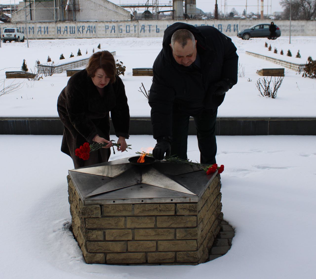 В честь Дня защитника Отечества Глава Администрации Троицкого муниципального округа Лариса Васильевна Резникова и председатель Совета депутатов Юрий Александрович Нечепуренко приняли участие в церемонии возложения цветов