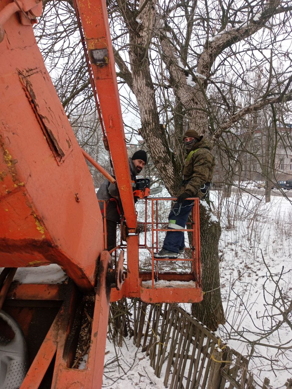 Также продолжаются работы по обрезке сухих и аварийных деревьев. Сегодня работы велись по адресам: пр. Ленина, 24 А, ул. Герцена и ул. Б. Хмельницкого, 52.