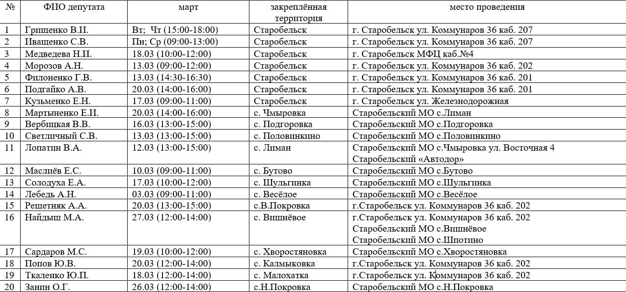Совет депутатов Старобельского муниципального округа утвердил график приема граждан на март 2026 года. Рекомендуем всем жителям сохранить этот график и активно пользоваться возможностью личного приема у депутатов по всем вопросам.