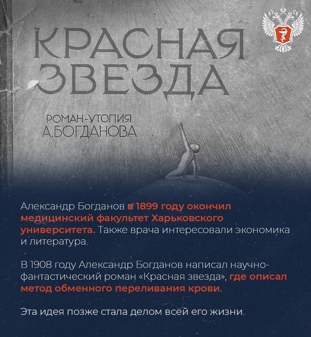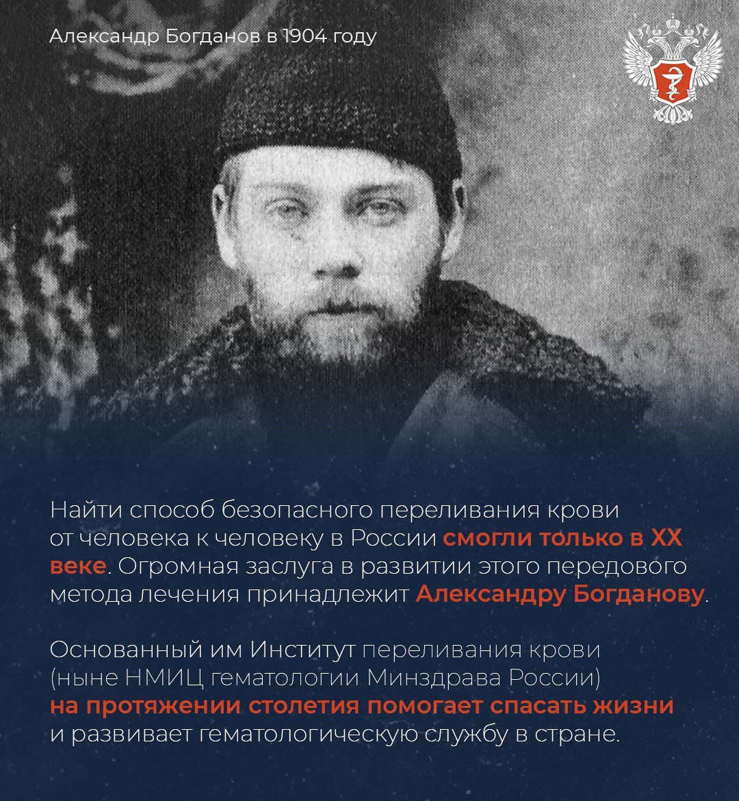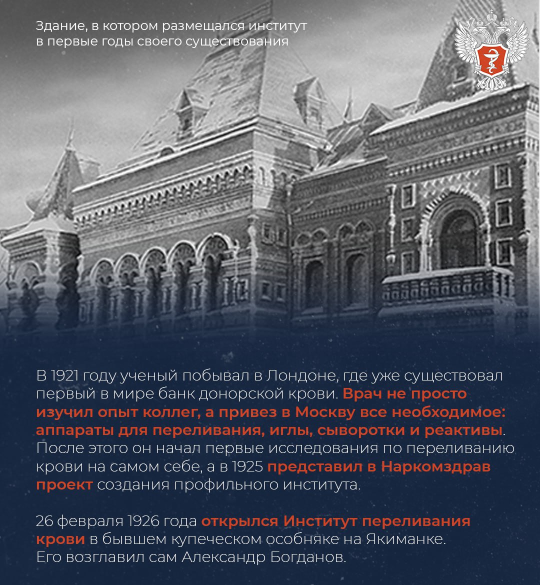 В честь юбилея мы расскажем об Александре Богданове — основателе института. Ученый посвятил жизнь медицине, а в 1928 году поставил на себе рискованный эксперимент во благо науки.