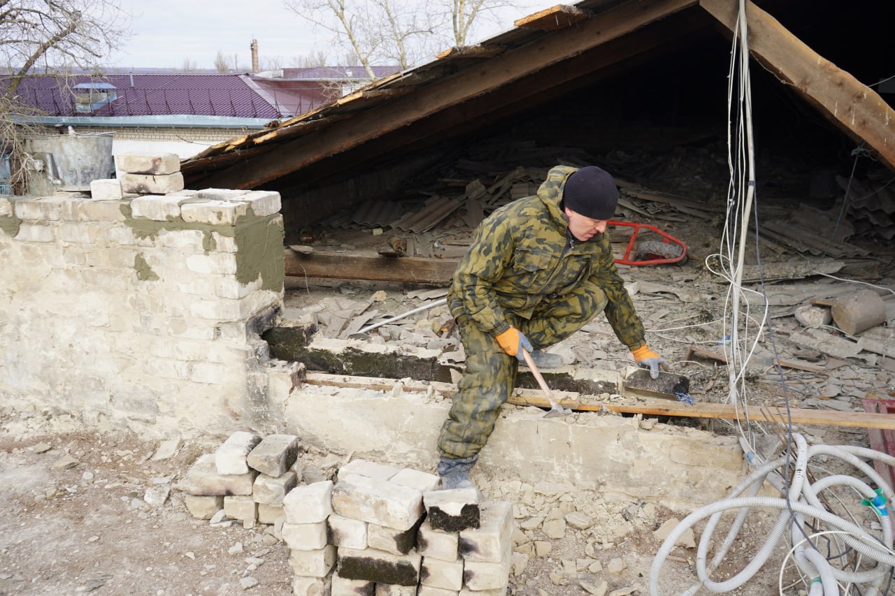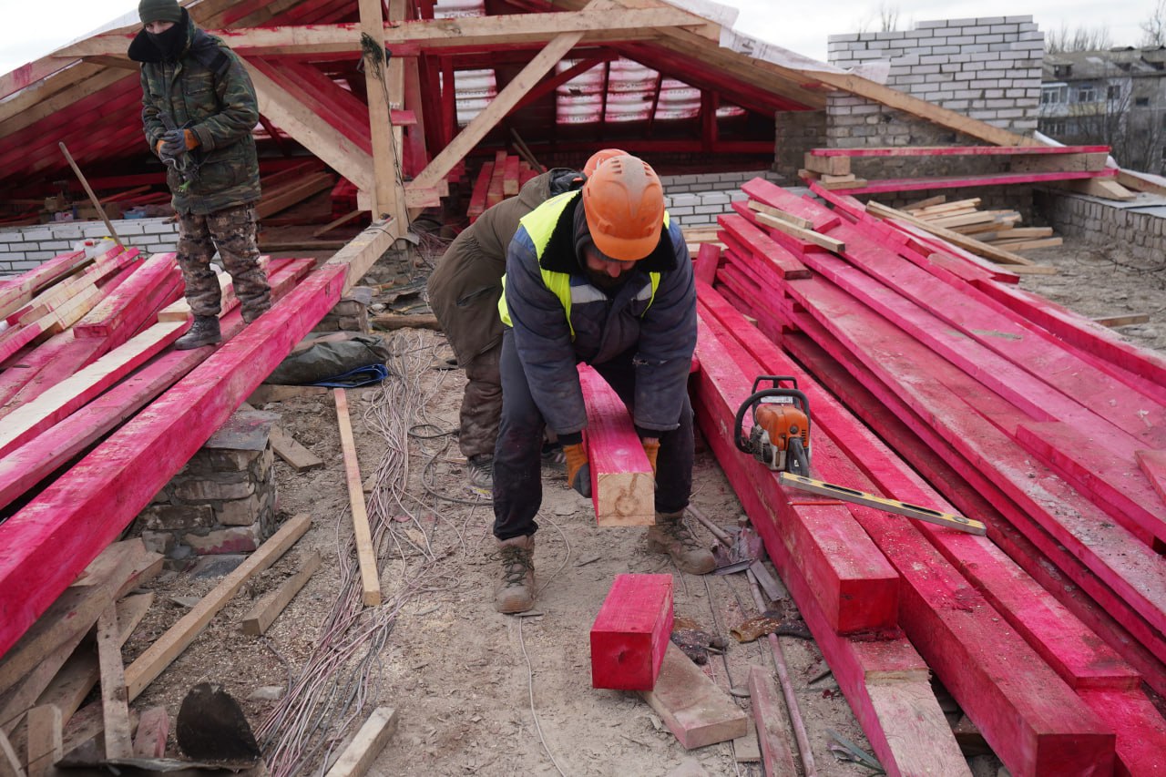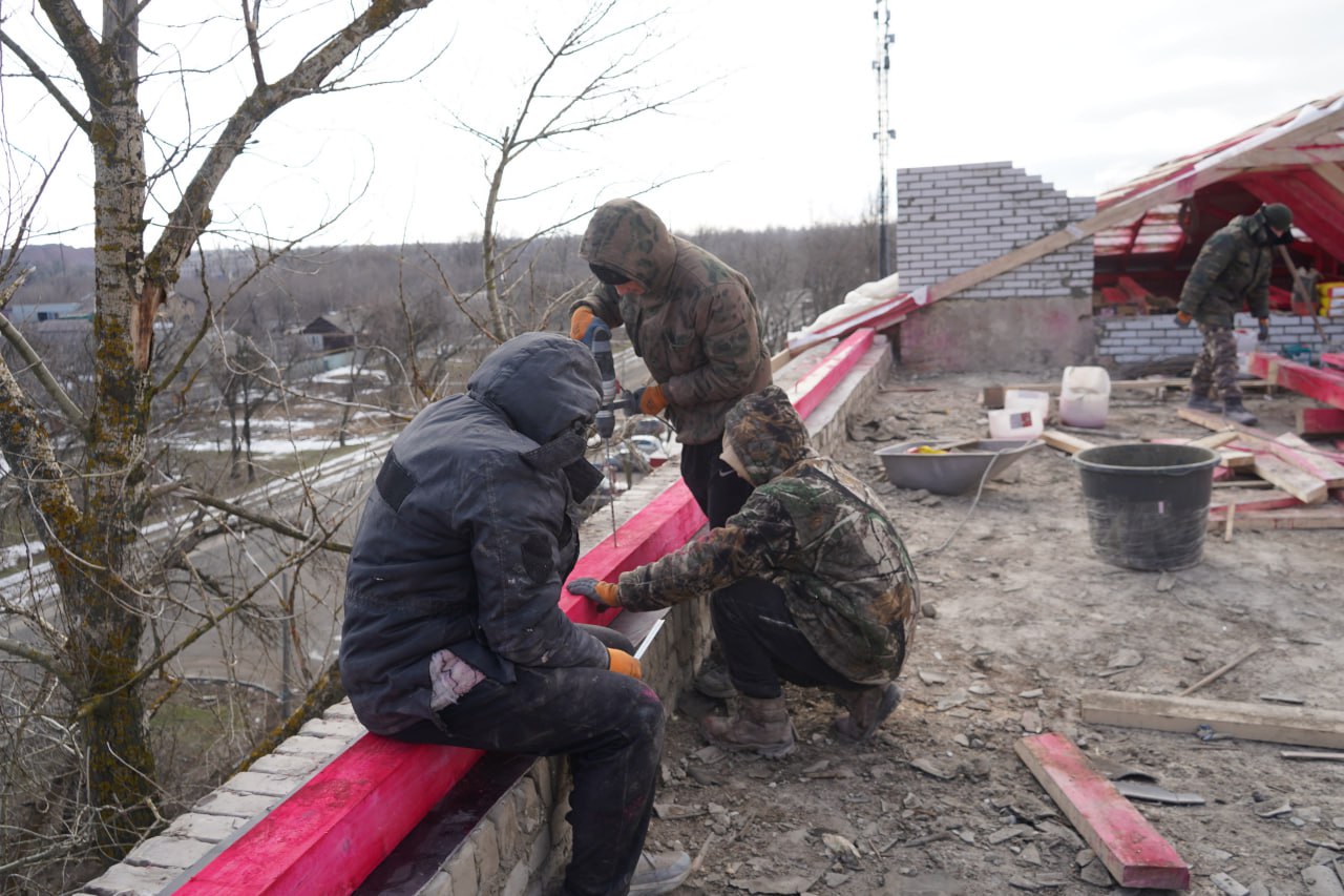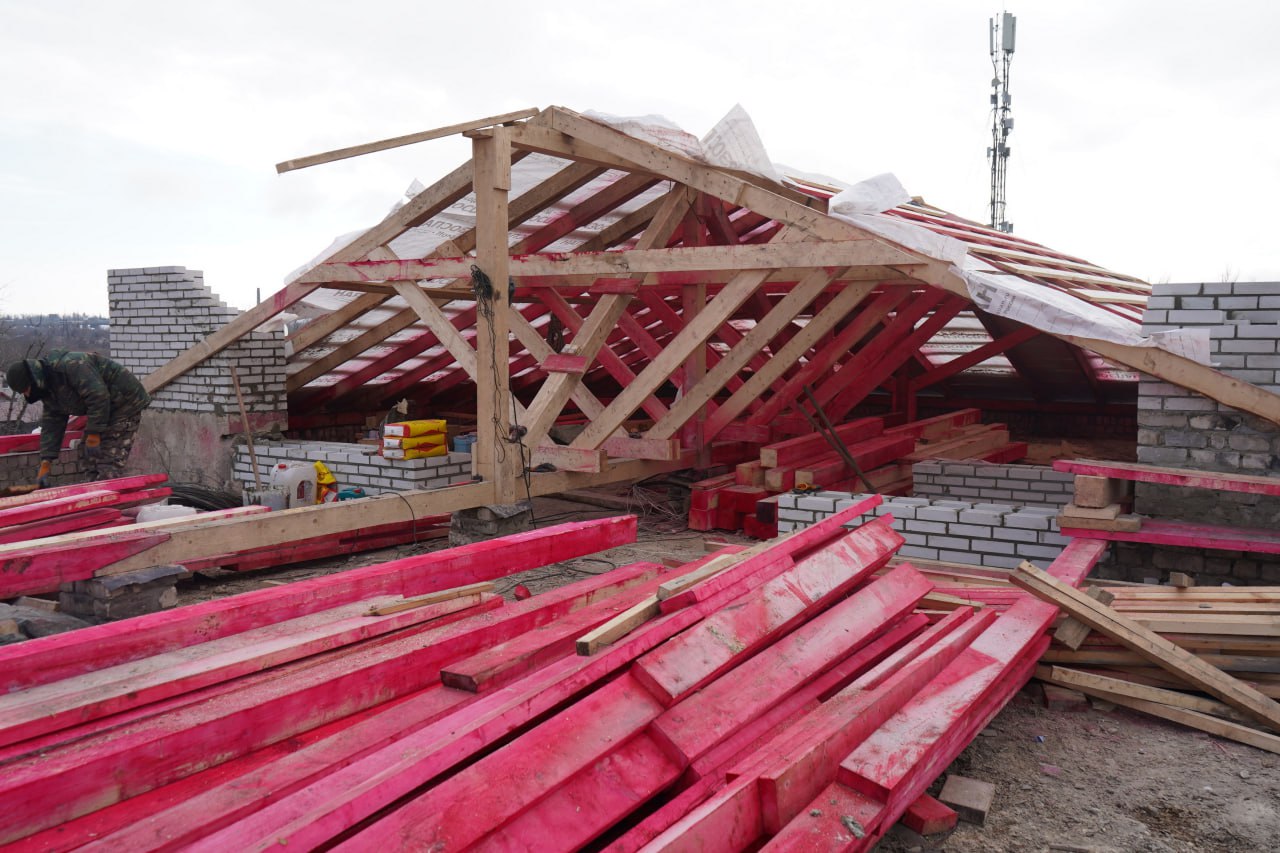 Строители демонтируют старое кровельное покрытие и устанавливают новое. После завершения этих работ будет смонтировано металлопрофильное покрытие, молниезащита и отмостка. Также установят ограждение и снегозадержатели. На данный момент стропильная система установлена на 15% от общего объема площади кровли.