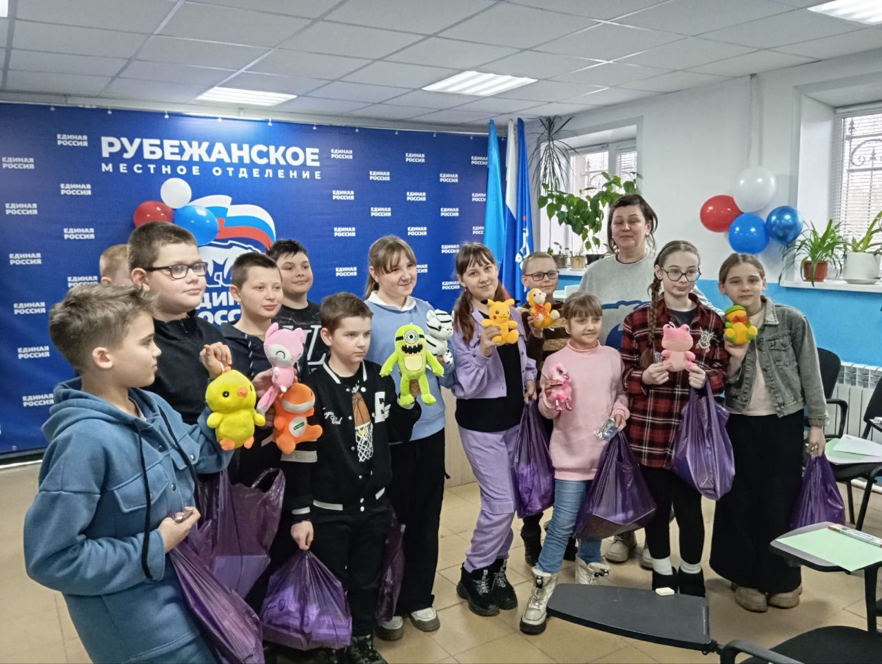Активистки «Женского движения Единой России» собрали в исполкоме Рубежанского местного отделения партии школьников города, которые нарисовали то, как они видят Русскую весну. После окончания работ каждый участник получил подарки от местного отделения и региона-шефа города: наборы для творчества и мягкие игрушки.