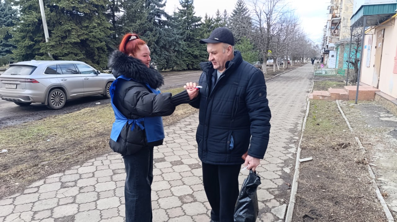 Горожане всех возрастов с теплом и благодарностью принимали символы патриотизма, закрепляя ленточки на одежде в знак солидарности и единства со всей страной.
