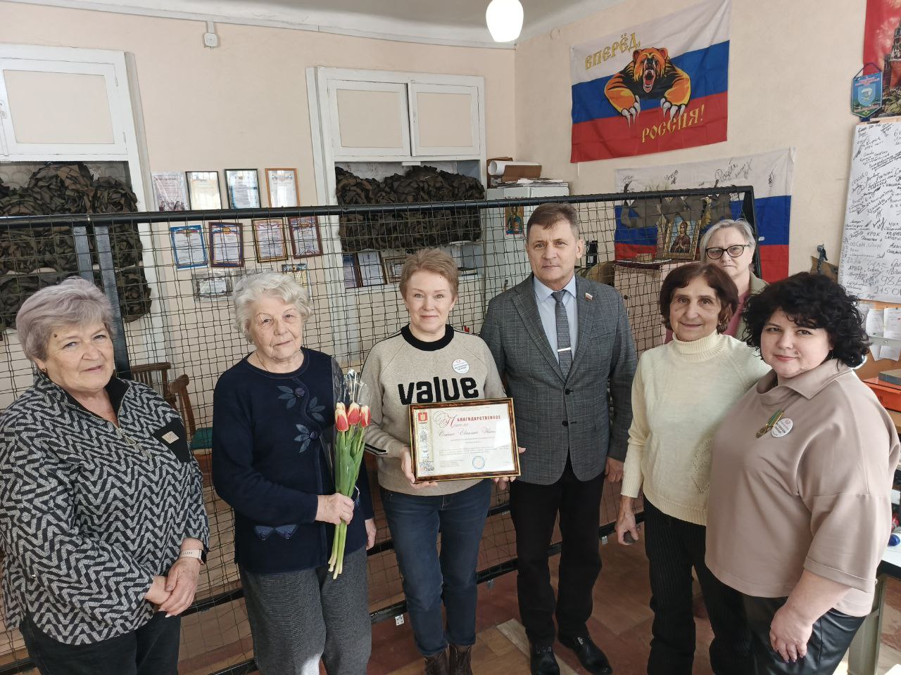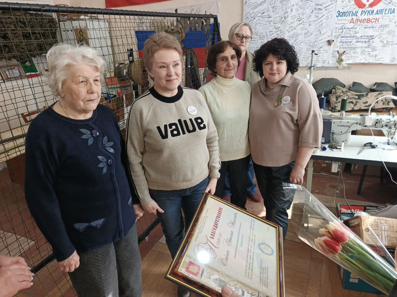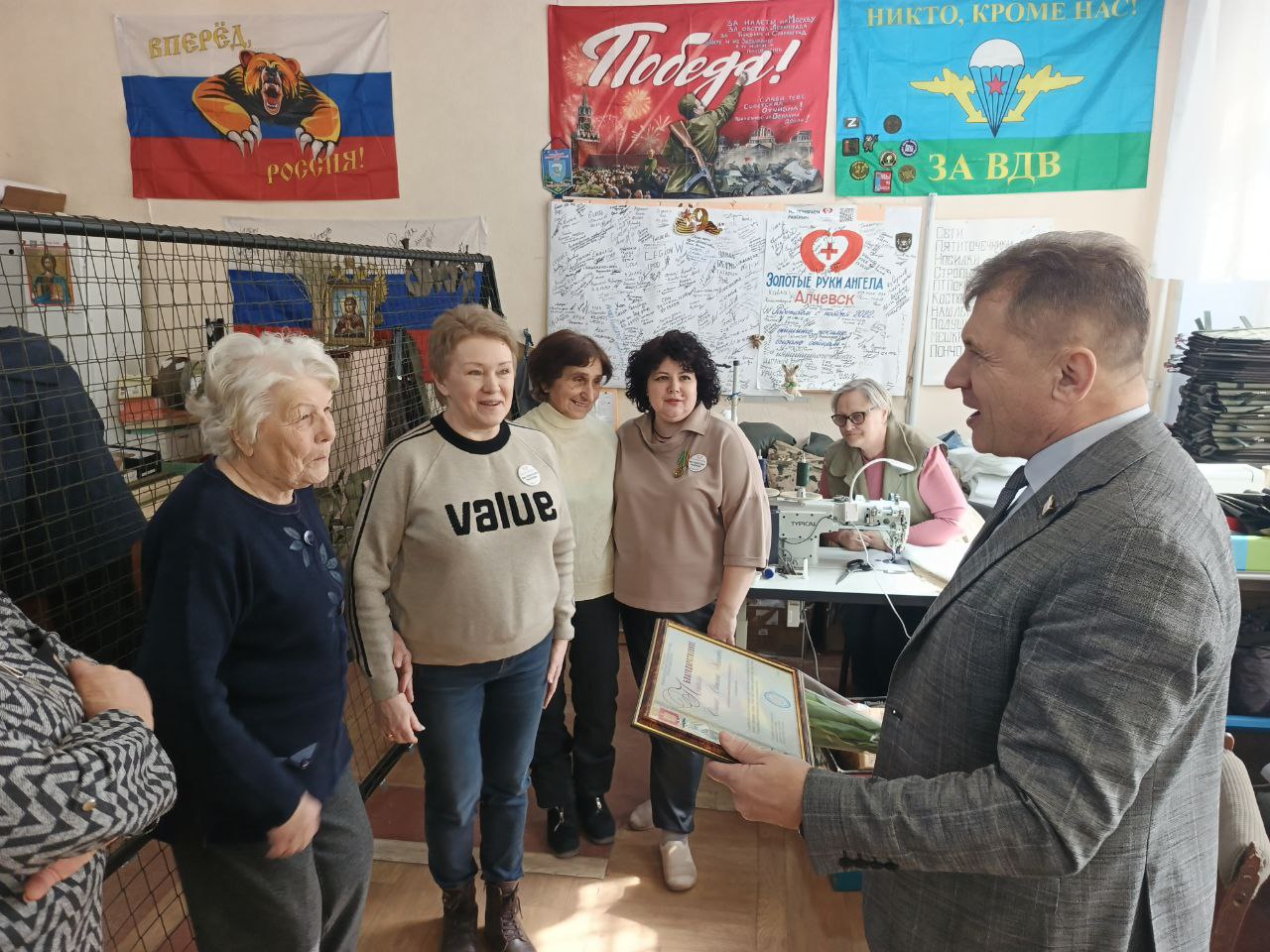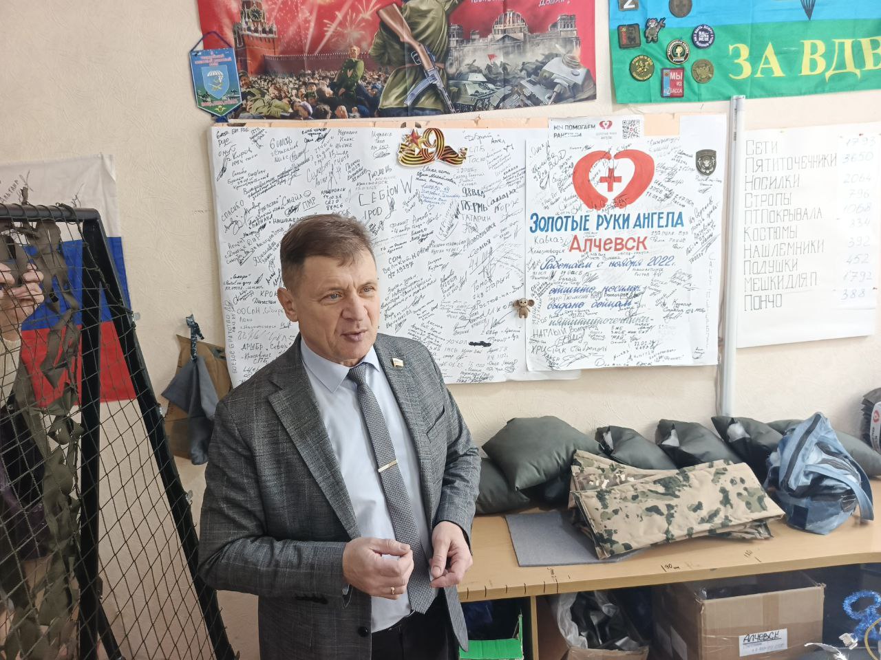 Председатель Совета городского округа город Алчевск Роман Лысенко посетил Алчевское отделение всероссийского волонтерского проекта «Золотые руки Ангела». Миссия данного визита носила почетный и символический характер, подчеркивая значимость труда волонтеров и их вклад в помощь нашим бойцам.