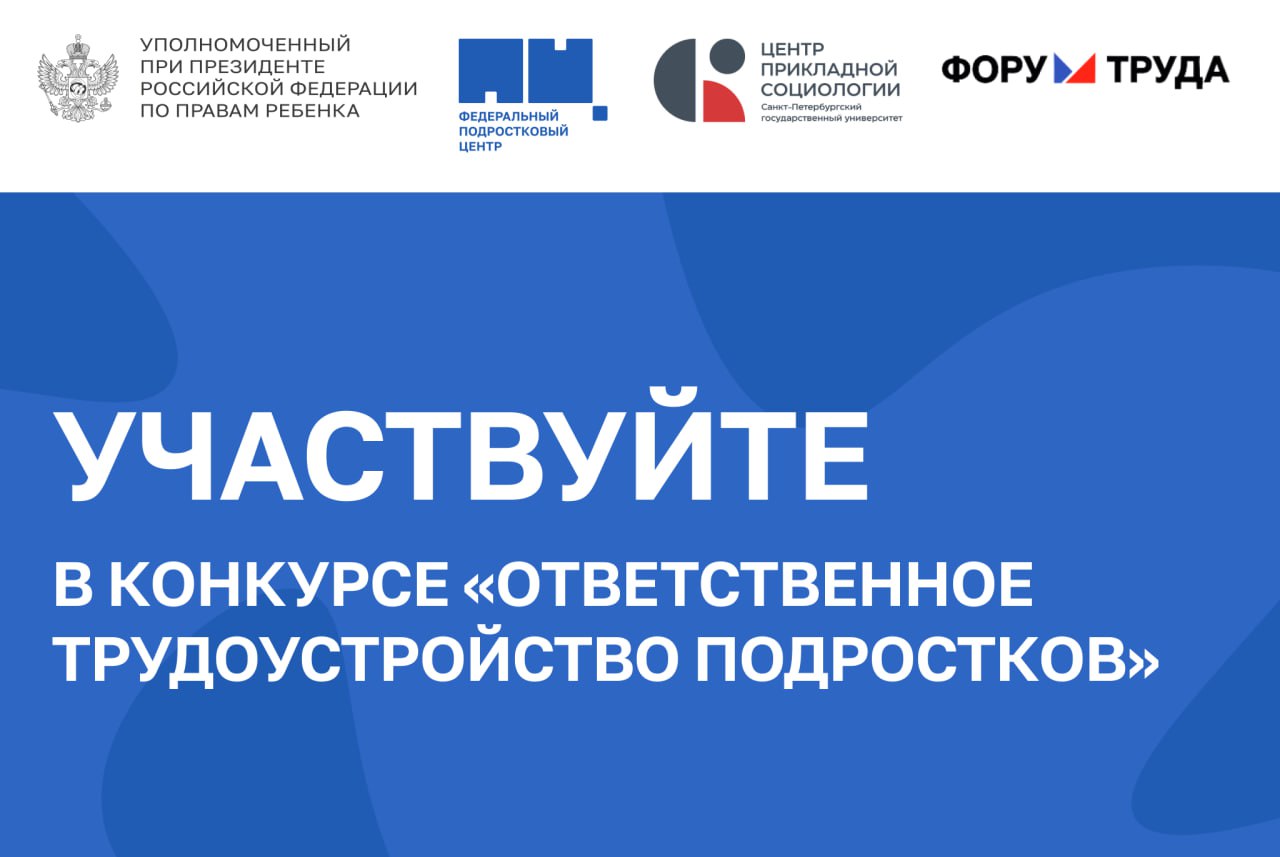 Территориальное отделение Государственного казенного учреждения «Республиканский центр занятости населения Луганской Народной Республики» в городе Краснодоне и Краснодонском районе информирует: уполномоченный при Президенте Российской Федерации по правам ребенка, Федеральный центр развития программ социализации подростков и Санкт-Петербургский государственный университет проводят конкурс, направленный на распространение лучших практик трудоустройства подростков в возрасте 14-18 лет.