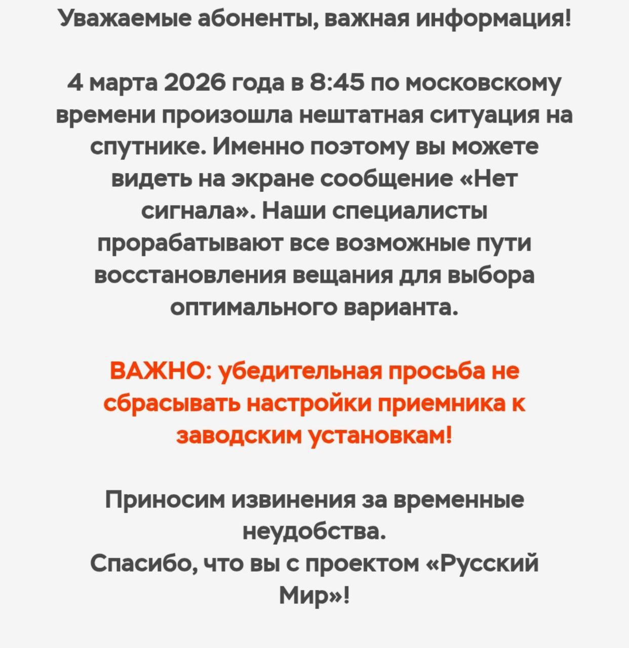 На сайте "Русский мир" появилось сообщение к абонентам с просьбой не сбрасывать настройки приёмника к заводским установкам