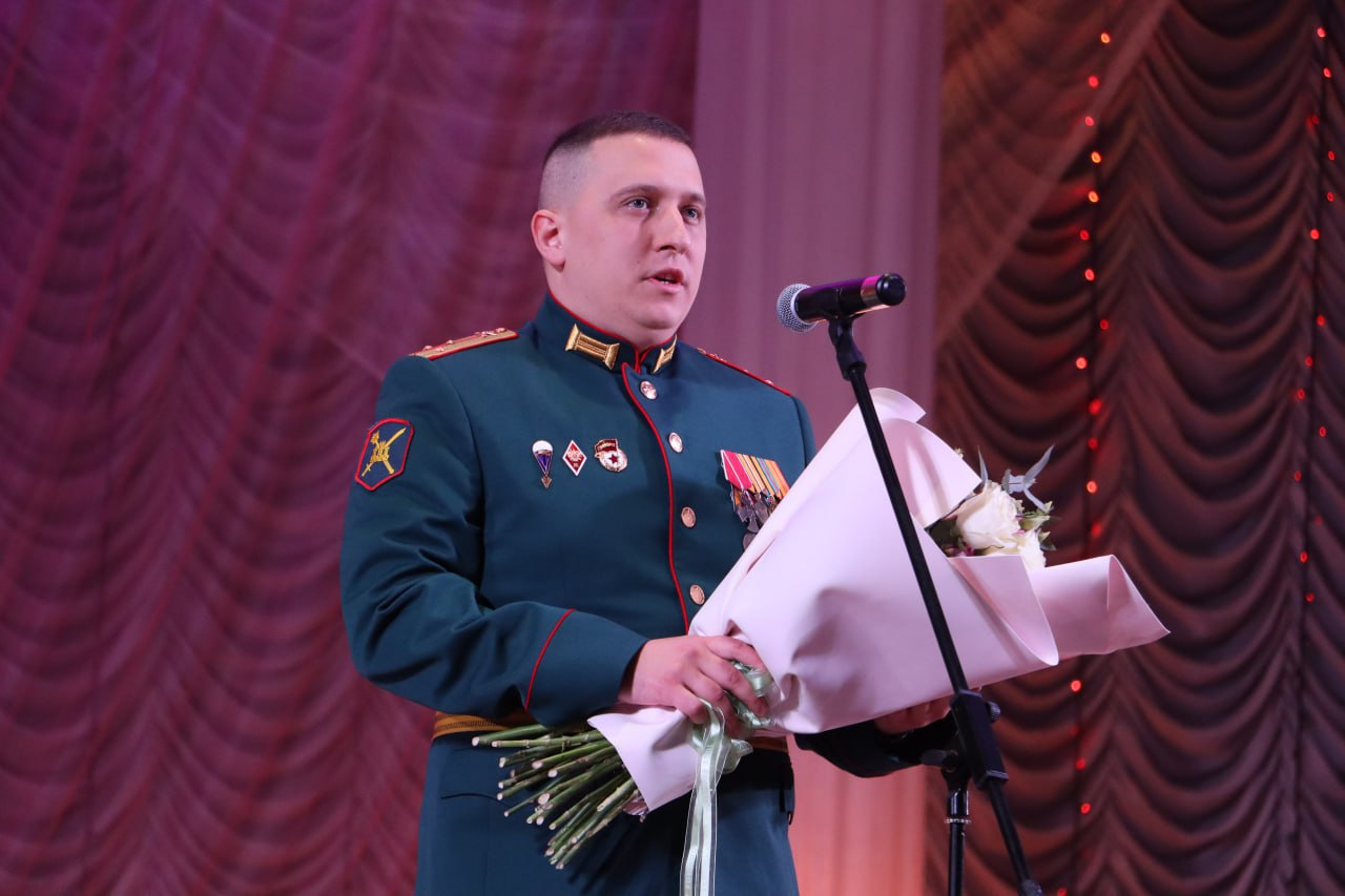 От лица военнослужащих присутствующих поздравил ветеран боевых действий, кавалер Ордена Мужества Владислав Жуков.