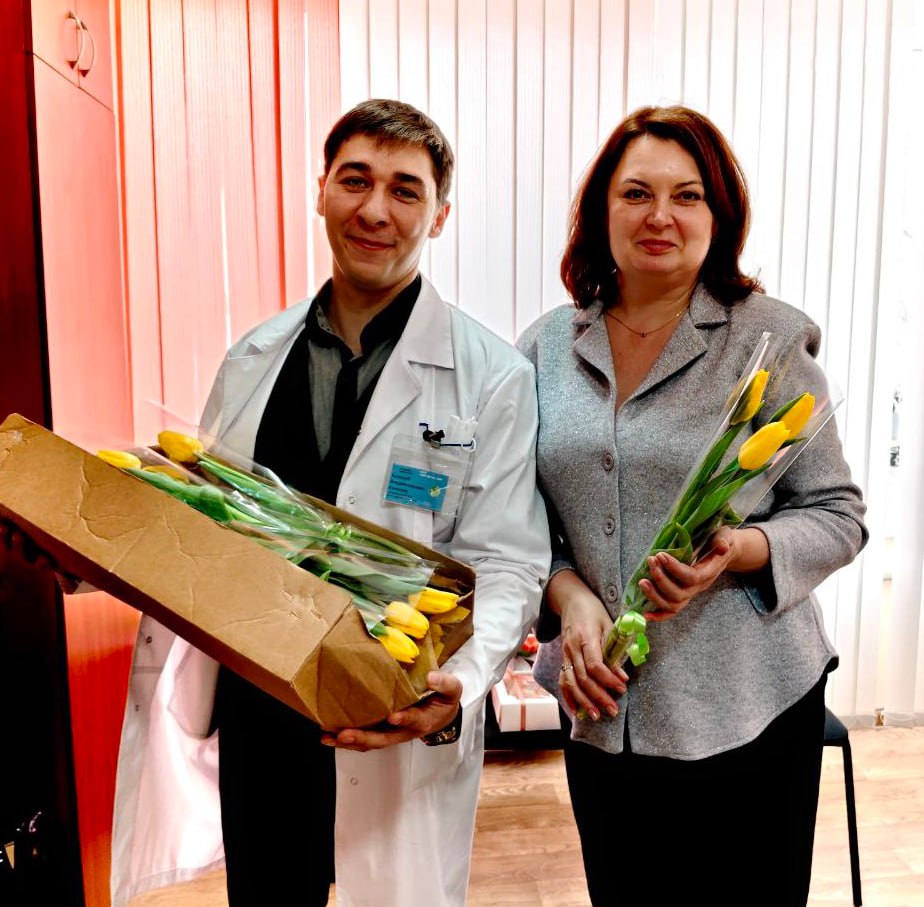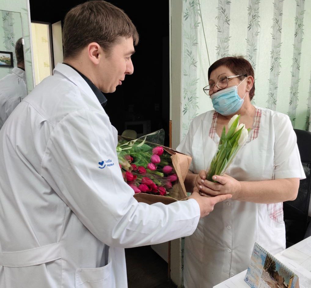 С самого утра с первыми весенними цветами и самыми искренними пожеланиями к женщинам обратился заведующий отделением, председатель профкома Алексей Солопов. Он лично обошел коллег, чтобы вручить каждой яркие букеты тюльпанов — символ весны, нежности и красоты.