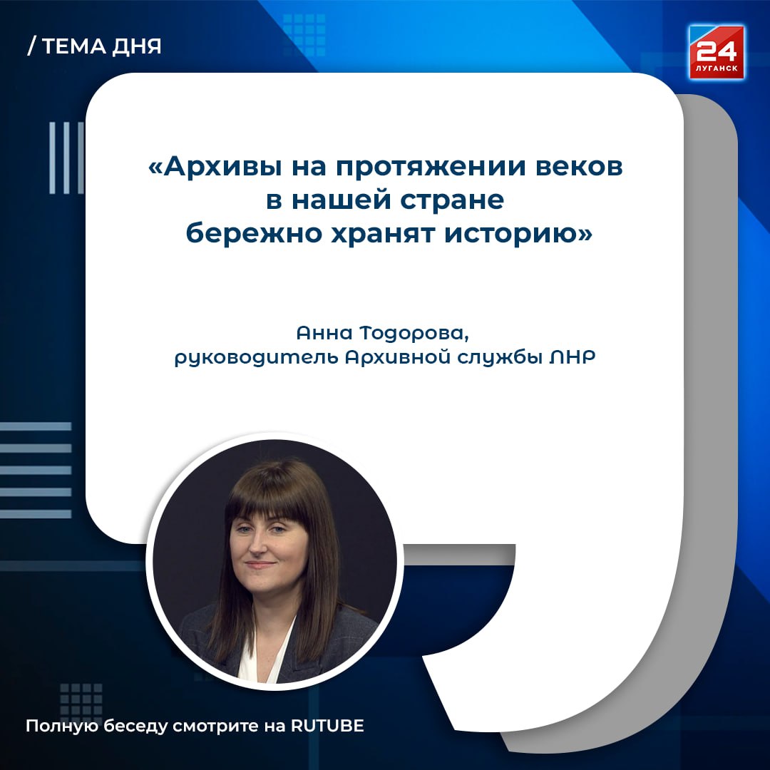 Больше о работе архивов, связывающих нас с прошлым, поговорили с Анной Тодоровой, руководителем Архивной службы ЛНР.