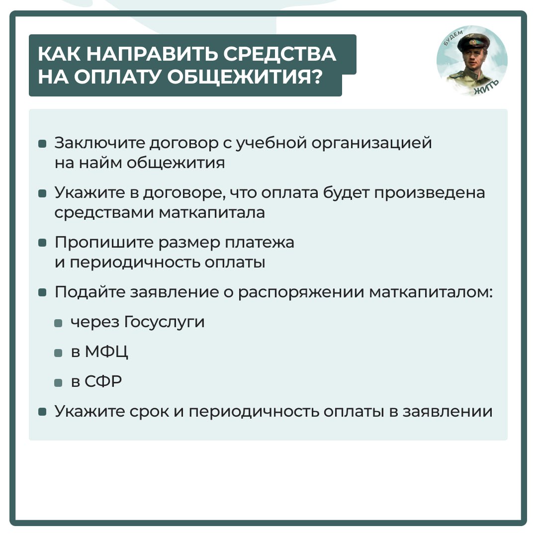 Оплата общежития для студентов с использованием материнского капитала