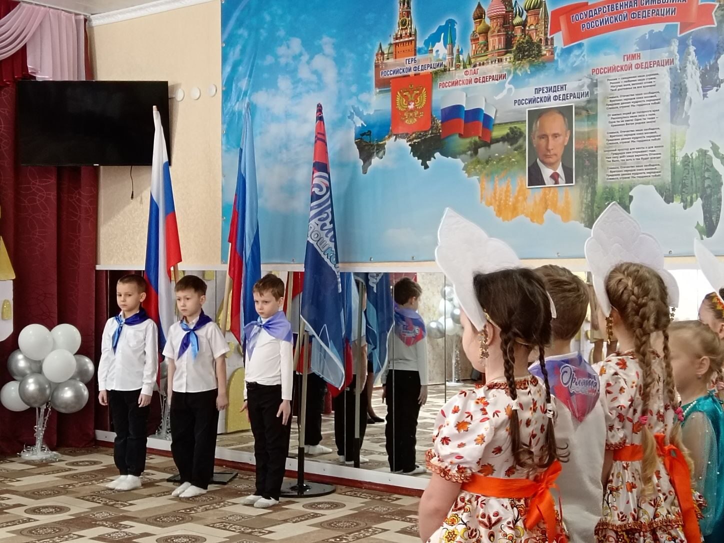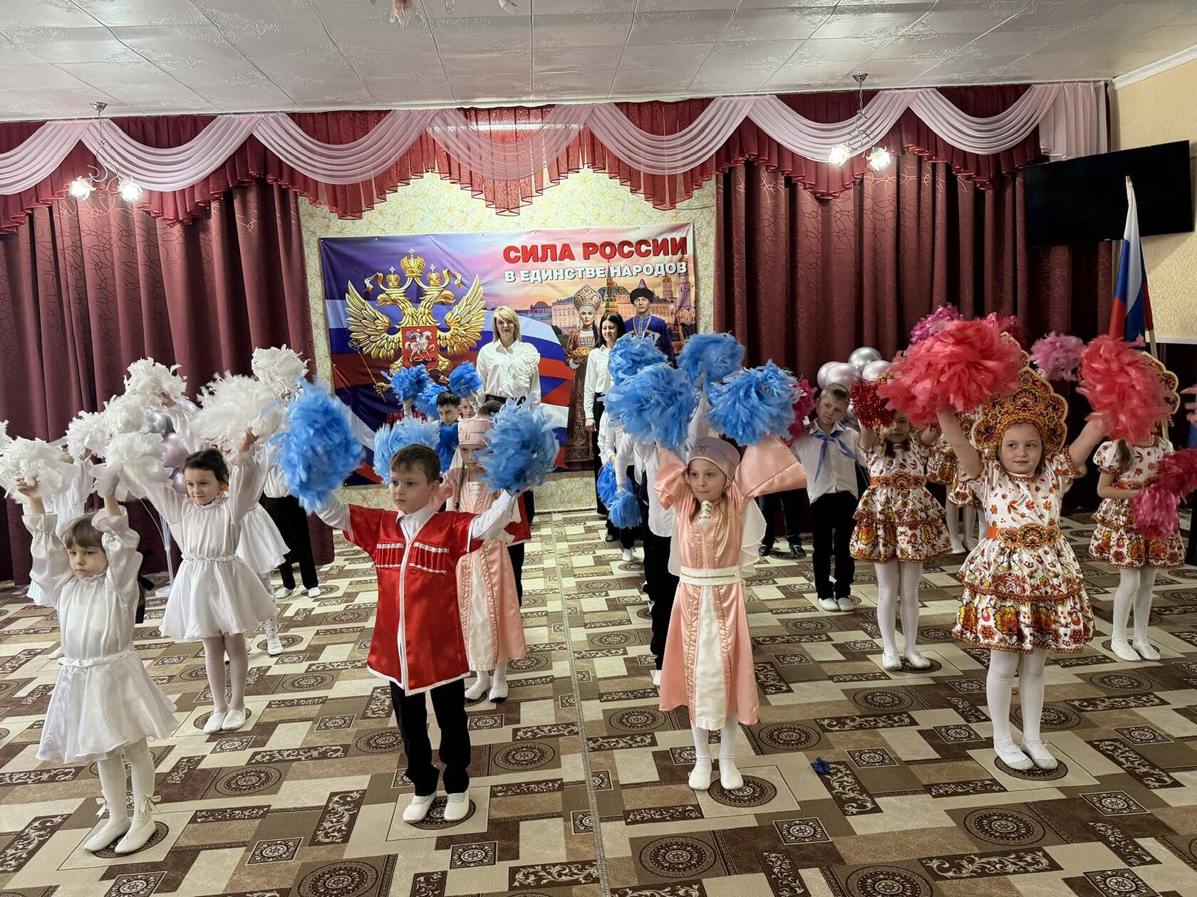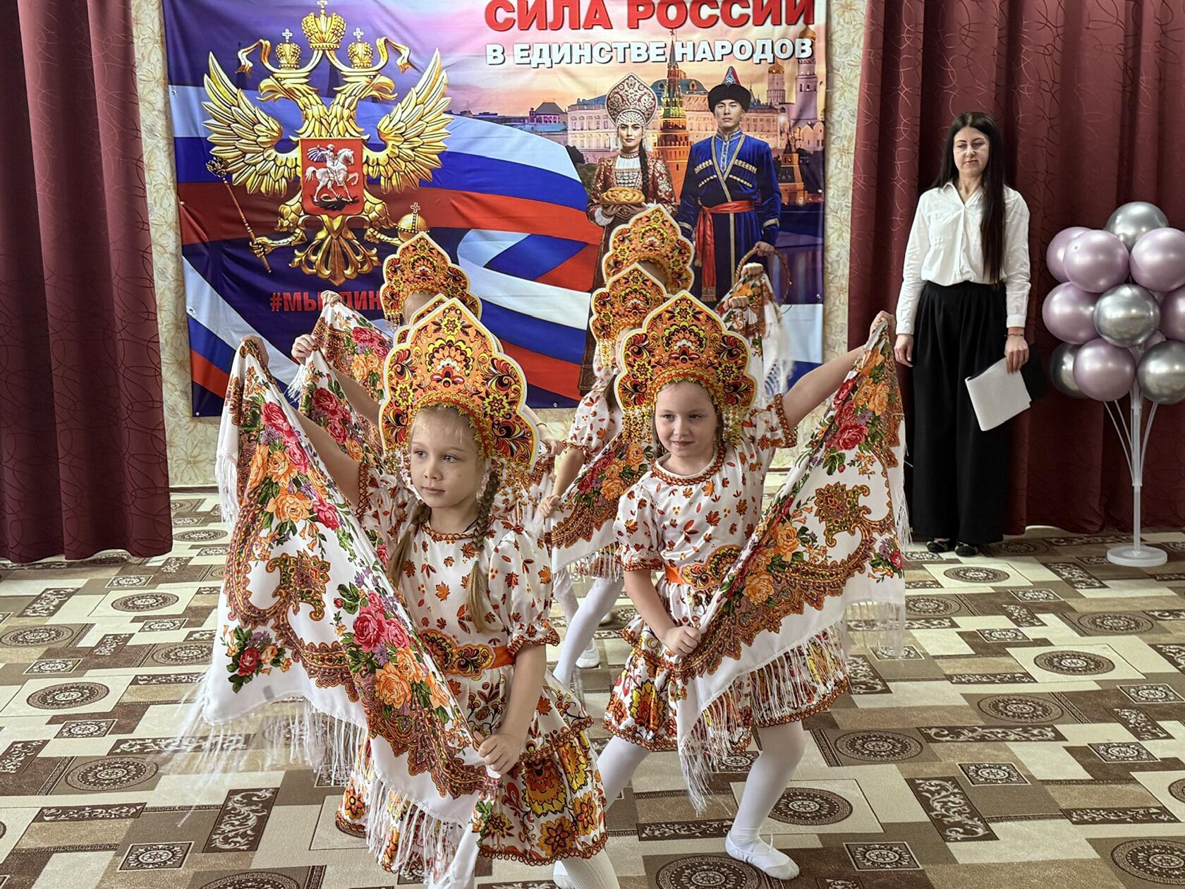 Праздник начался с торжественного выноса флагов РФ, ЛНР, «Орлят-дошколят» и звучания гимна РФ и ЛНР. Этот волнующий ритуал ознаменовал старт Года единства народов России.