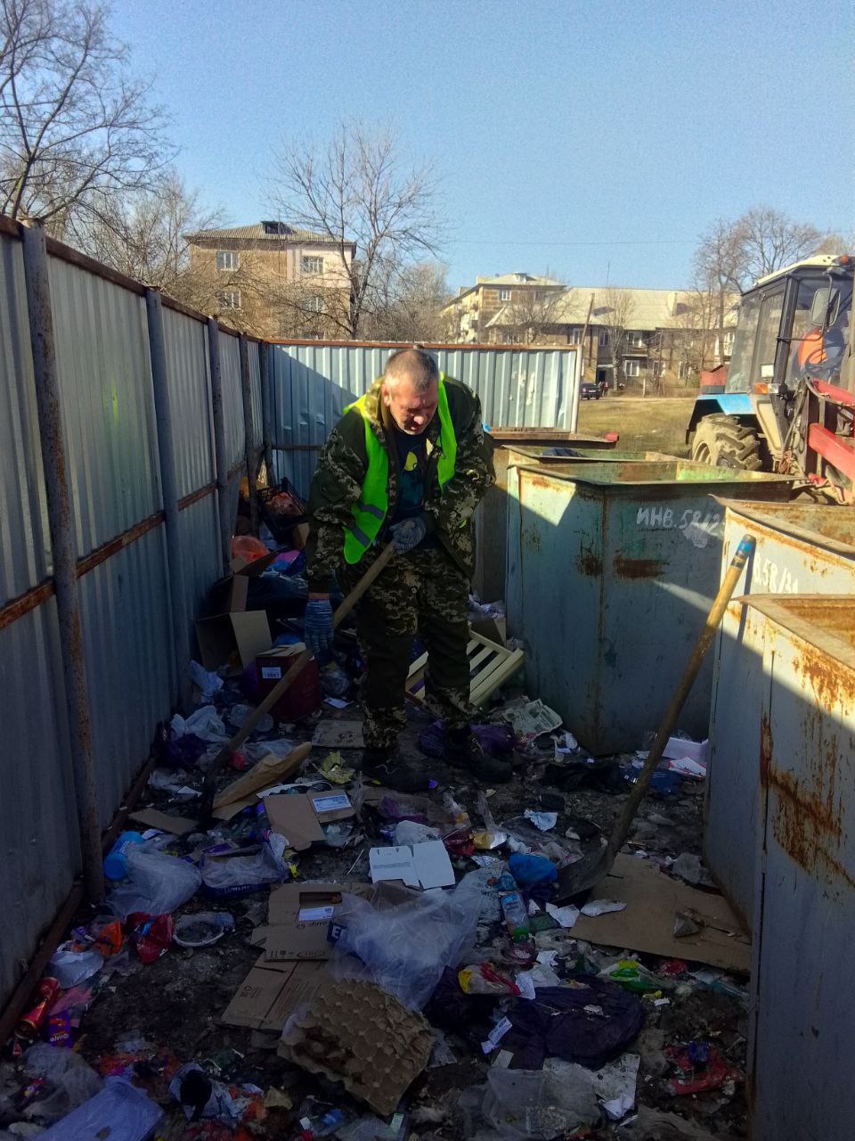 Коммунальная служба г. Ирмино вывозила мусор с навалов, образовавшихся возле площадок, по адресам в Ирмино: