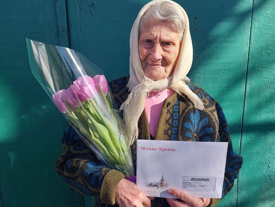 Они передали имениннице конверт с поздравлениями от Президента РФ Владимира Путина, а также продуктовый набор от Красноярского регионального отделения ВПП «Единая Россия».
