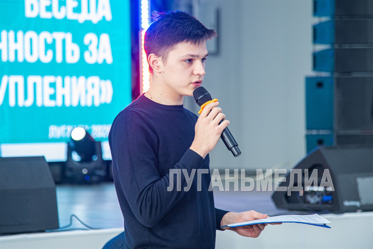 Старший оперуполномоченный Центра по противодействию экстремизму МВД по ЛНР Елисей Кочержин напомнил присутствующим, что незнание закона не является основанием для освобождения от ответственности. Он подчеркнул, что это правило распространяется и на несовершеннолетних, которые могут быть привлечены как к административной, так и уголовной ответственности.