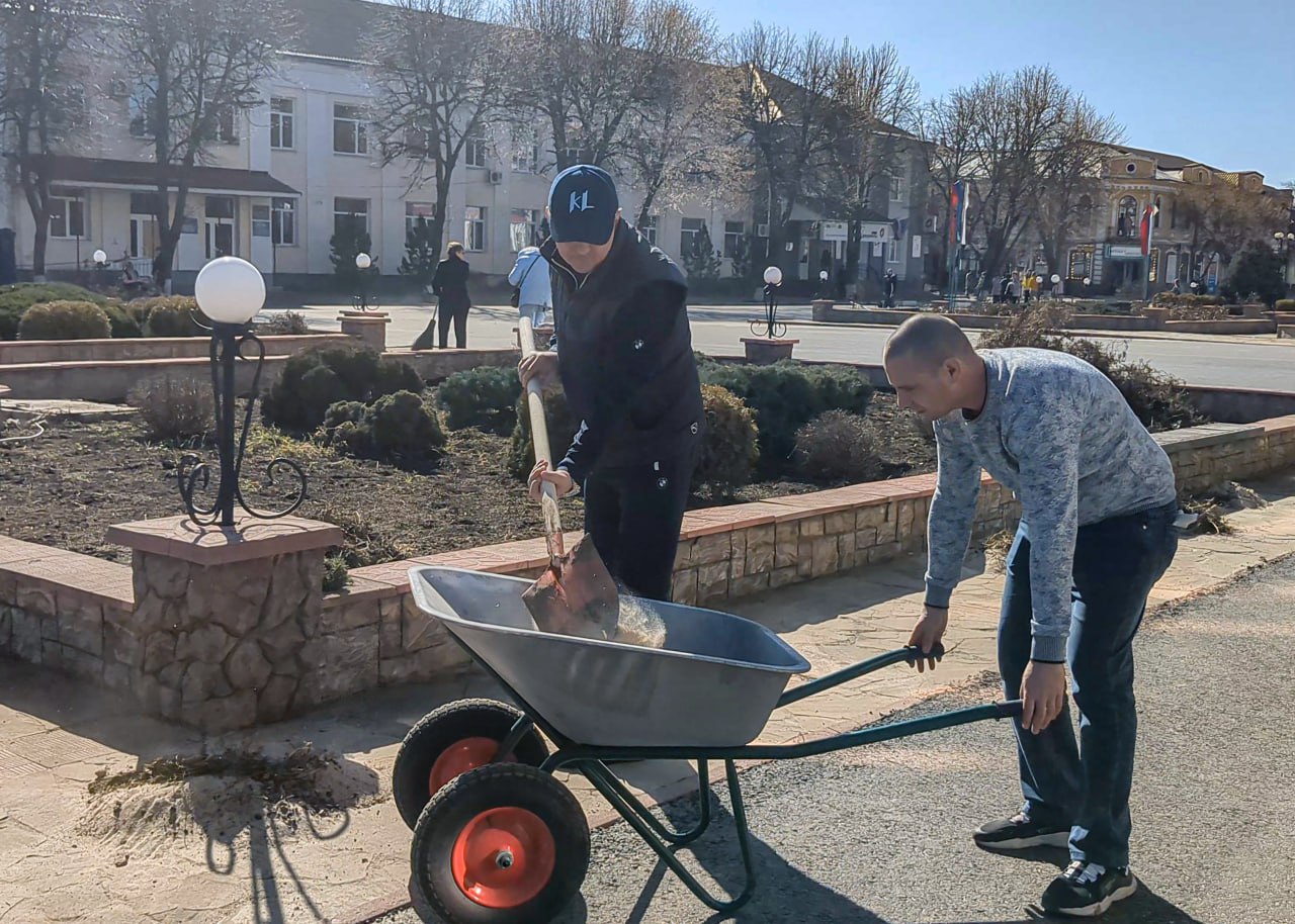 Сегодня работники Администрации Старобельского муниципального округа вышли на субботник и привели в порядок территорию центральной площади города.