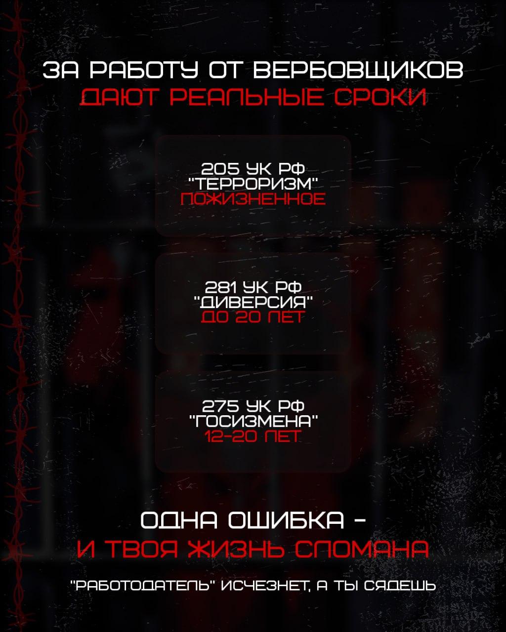 За такие «задания» дают реальные статьи за диверсию, терроризм и госизмену. Не верь в «лёгкий заработок» и не принимай предложения от незнакомцев.