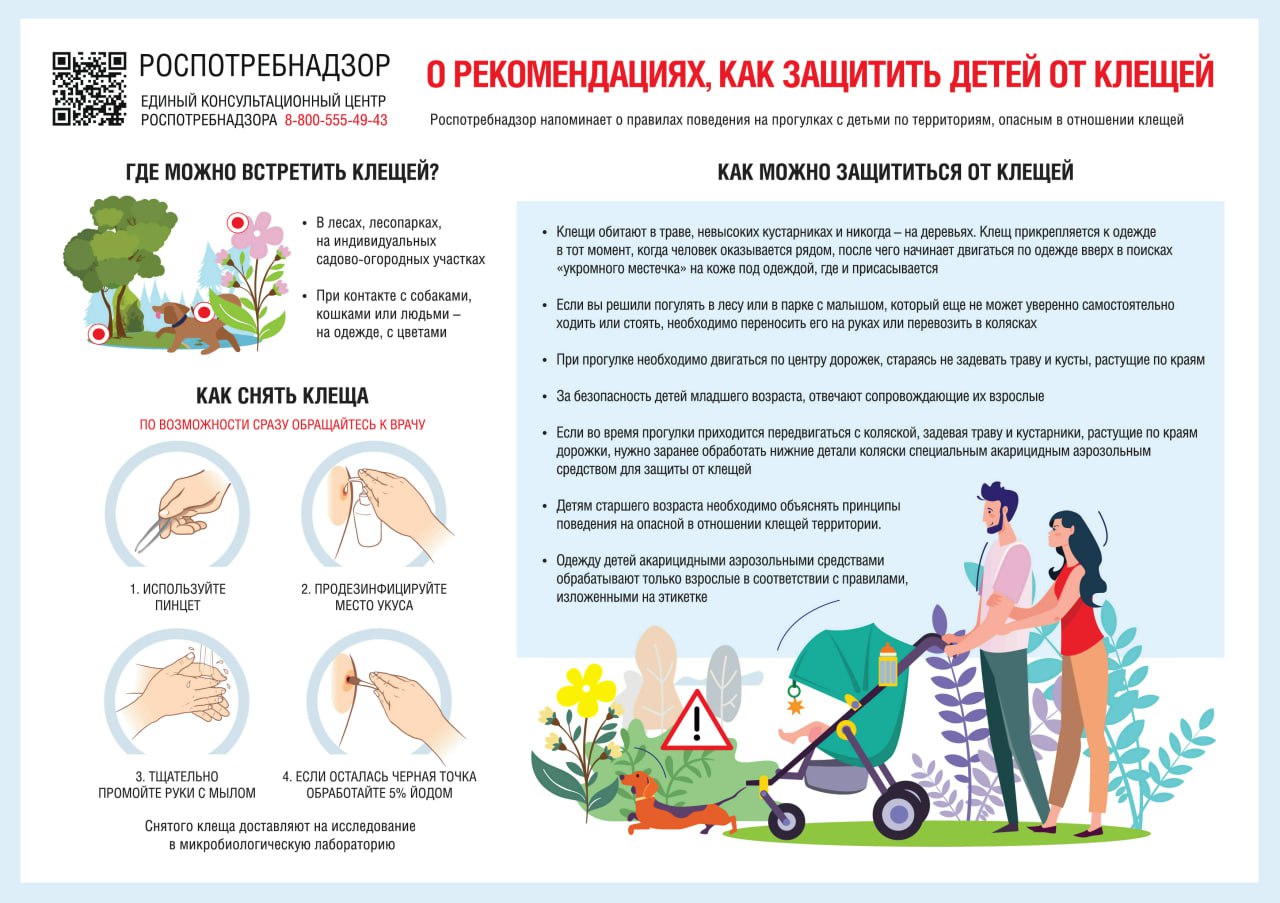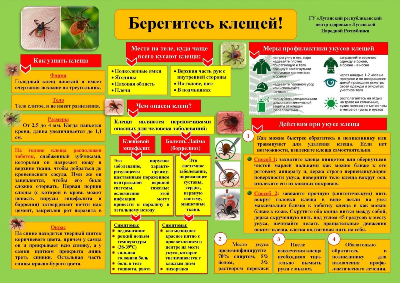 При укусе клеща обратитесь в ближайший травмпункт для удаления клеща. Если медицинское учреждение находится далеко - удалите клеща самостоятельно так, чтоб головка клеща не осталась в ране;