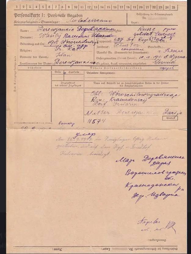 В ходе работы были обнаружены документы, содержащие сведения о нашем земляке – жителе пгт Изварино, Деревянкине Василии Ивановиче.