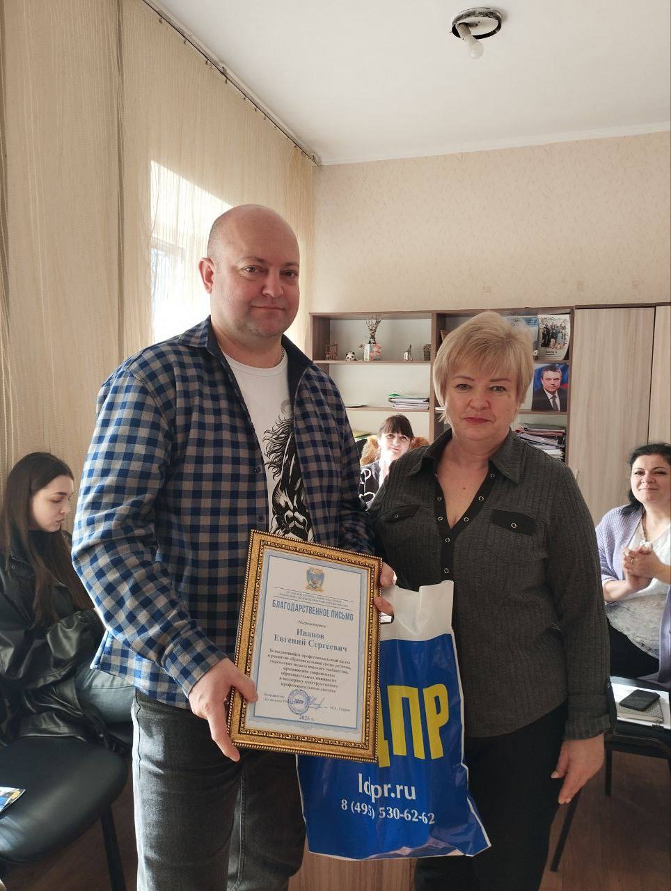 Особое внимание было уделено признанию труда работников культуры. В рамках встречи депутат вручила благодарственное письмо преподавателю «Народного отдела» Евгению Иванову. Награда была передана от координатора Луганского регионального отделения ЛДПР Максима Уварова – за самоотверженный труд и преданность своему делу.