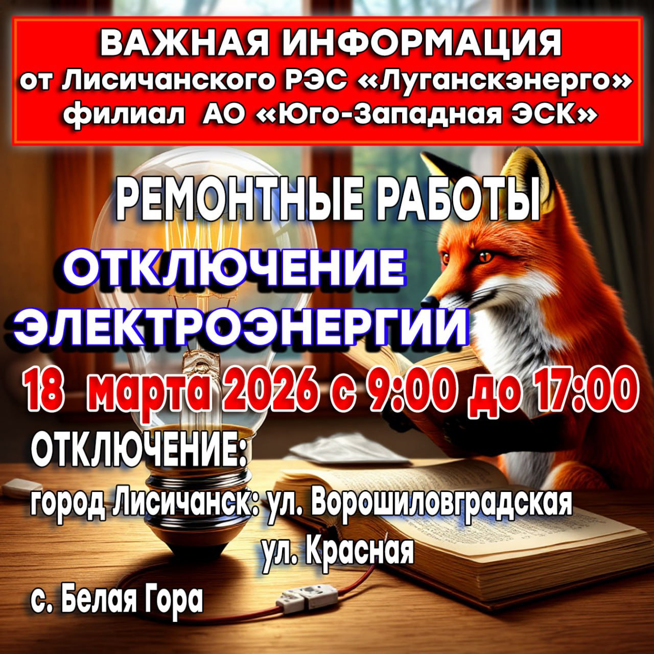 Лисичанский РЭС «Луганскэнерго» филиал АО «Юго-Западная ЭСК» информирует потребителей о плановом отключении электроэнергии в связи с ремонтными работами!