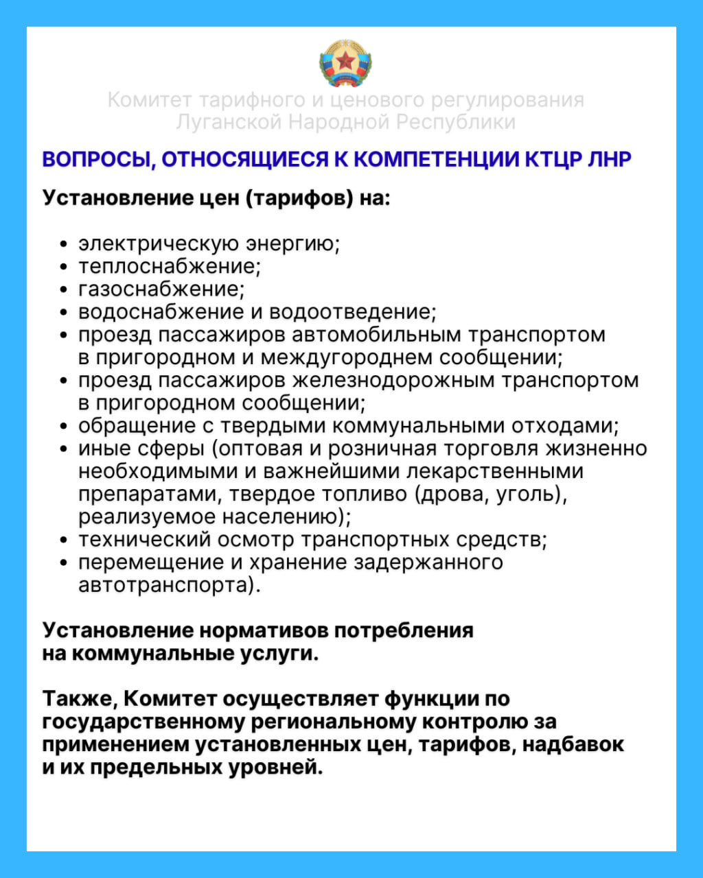 18 марта 2026 года состоится выездное совещание с председателем Комитета тарифного и ценового регулирования Луганской Народной Республики – Духиной Ларисой Михайловной, в ходе которого желающие могут задать актуальные вопросы и обсудить проблемные ситуации.