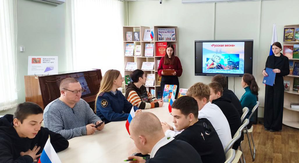 Сегодня на базе Антрацитовской городской централизованной библиотечной системы сотрудники модельной библиотеки провели для несовершеннолетних, состоящих на профилактическом учете в ОПДН ОУУПиПДН ОМВД, познавательное мероприятие "Русская весна".