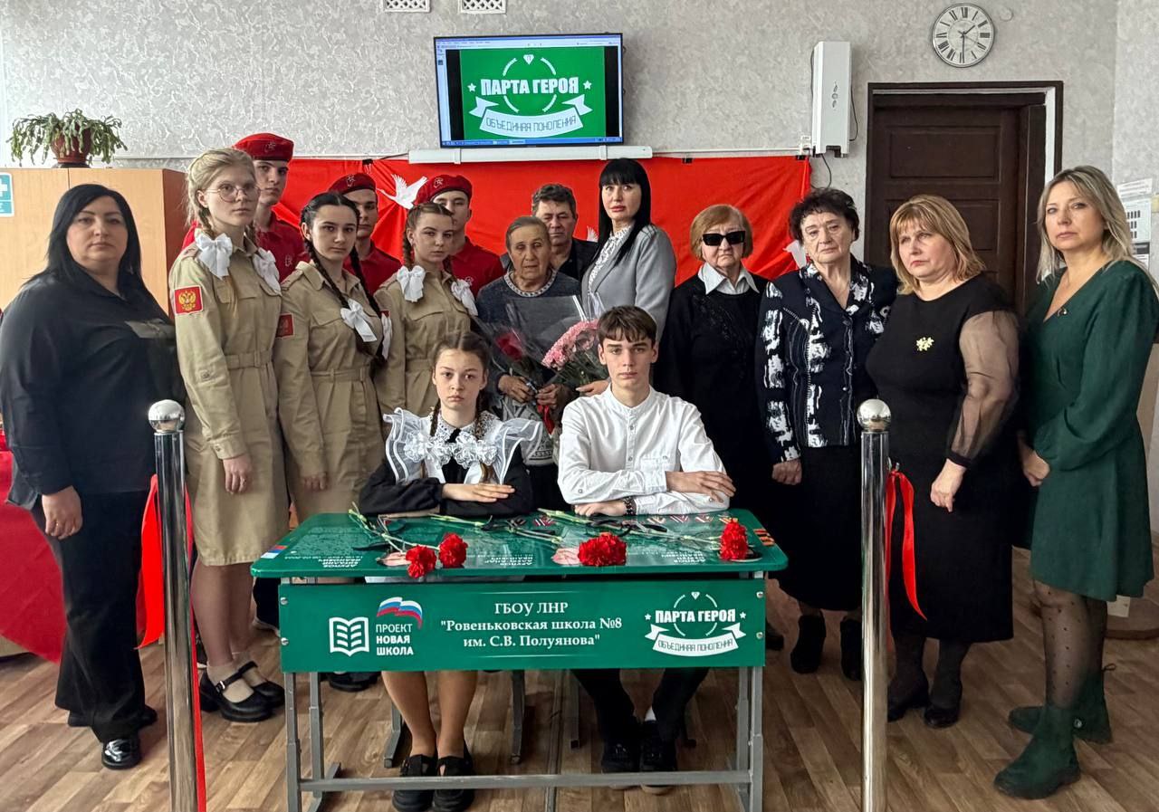 Сегодня Ровеньковская школа № 8 им. С.В. Полуянова в четвертый раз присоединилась ко Всероссийскому образовательному проекту «Парта Героя», который реализуется по инициативе партии «Единая Россия» с 2018 года. В школе появился еще один островок Памяти героического настоящего нашей Родины - Парта Героев, выпускников школы, братьев Друповых Виталия, Александра и Сергея, отдавших свои жизни за наше Отечество. На мероприятии присутствовала активист КСВО ЛНР Анна Писаревская, которая отметила значимость данного мероприятия. Анна Писаревская высказала слова благодарности маме погибших героев за воспитание сыновей – настоящих героев нашего времени, пожелала ей и всем присутствующим мира и добра. «Парта Героев» станет тем самым зримым символом уважения и памяти о погибших братьях за свою родную землю. Школьники, односельчане, горожане, и те, кому жить и учиться здесь в будущем, будут знать и помнить о подвиге братьев-героев.