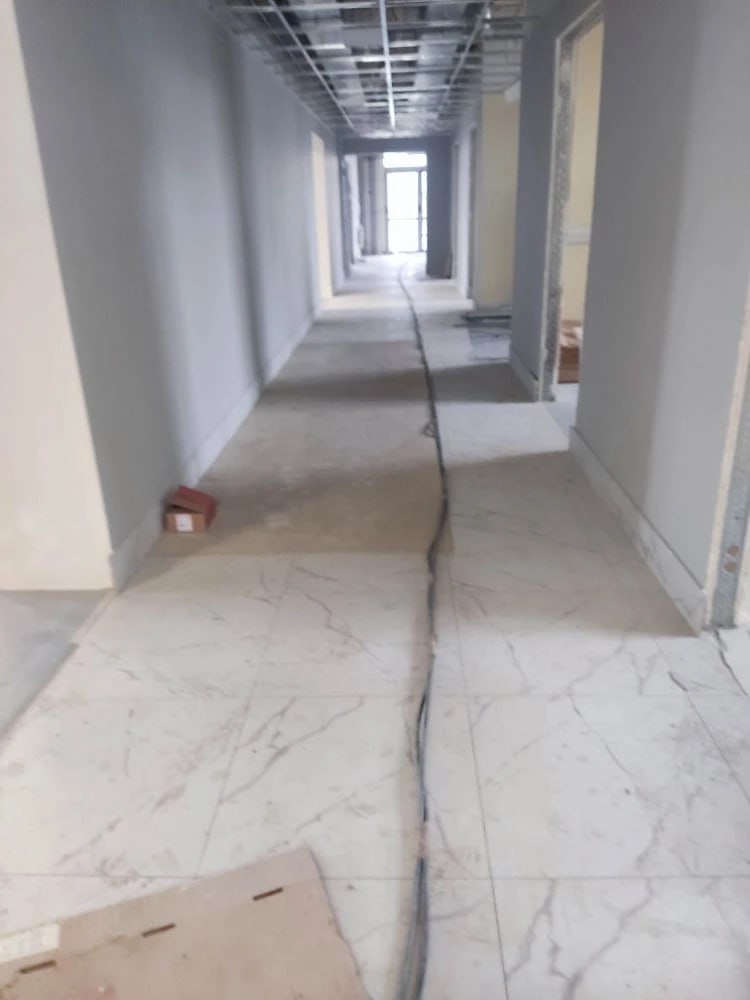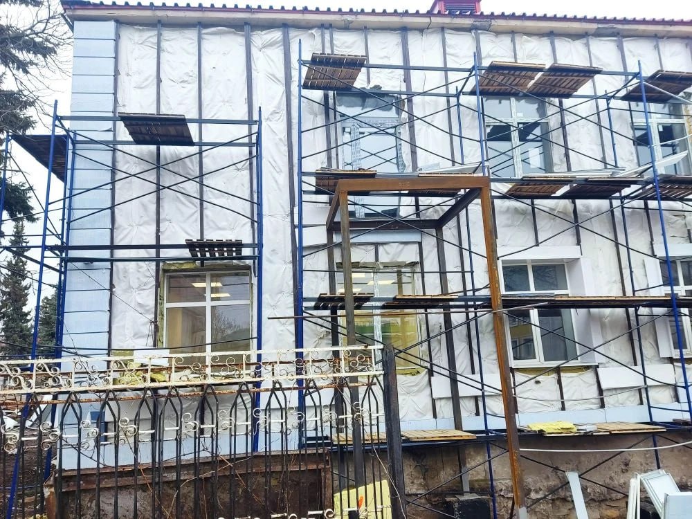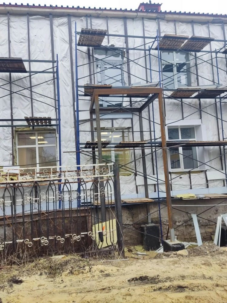 На объекте идут масштабные ремонтные работы: строители продолжают фасадны работы, а внутри завершается отделка помещений — в том числе монтируется пожарная лестница.