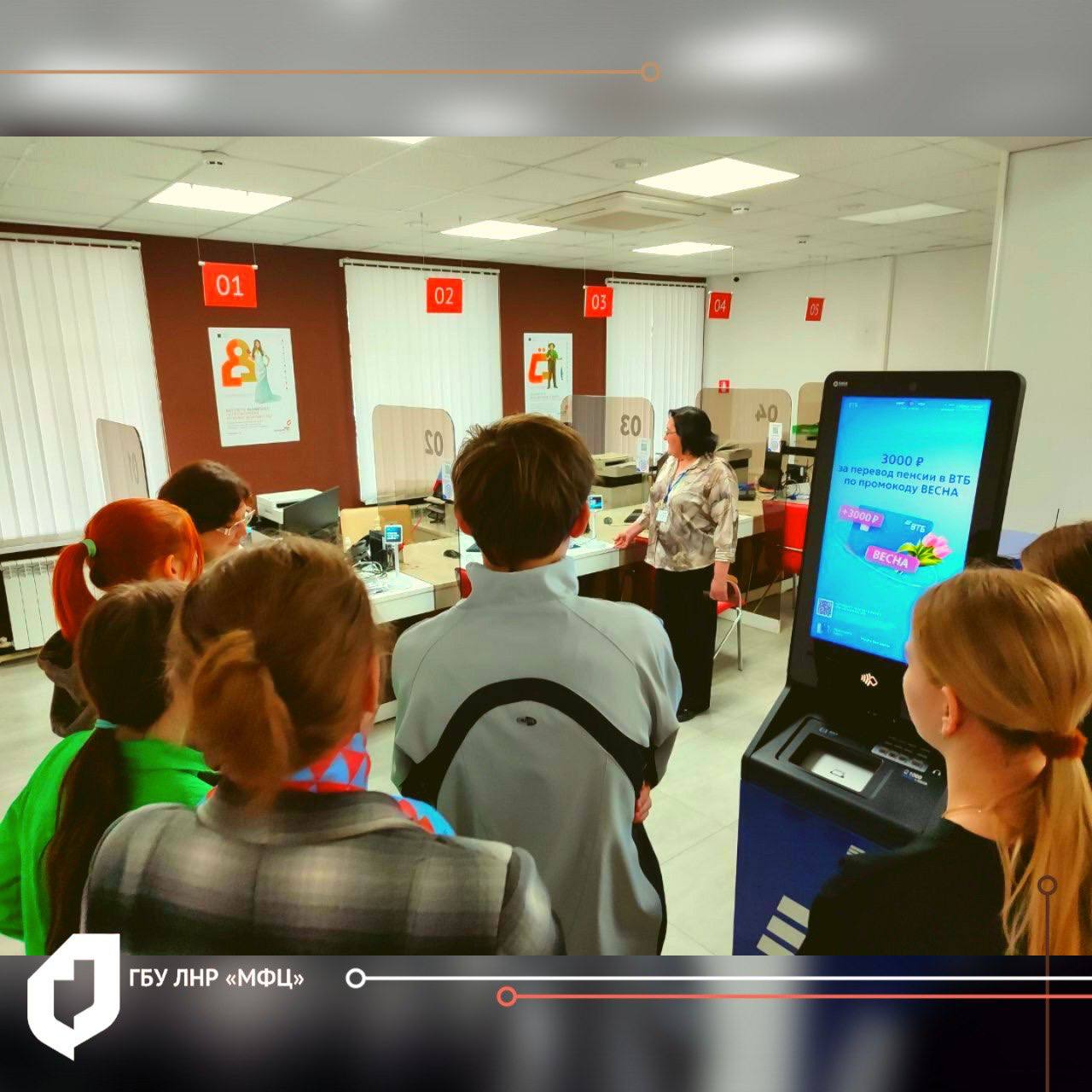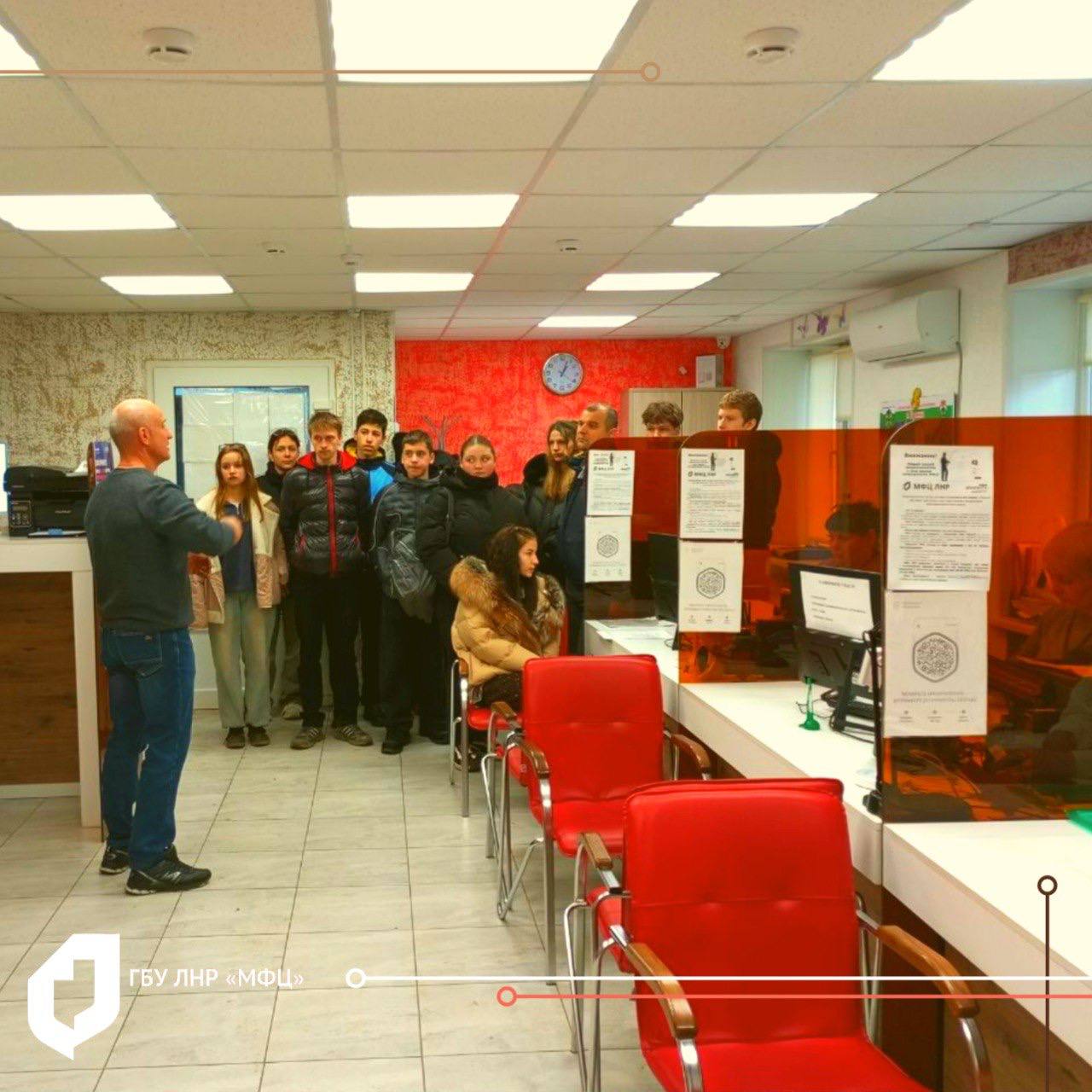 В рамках республиканского дня профориентации молодёжи "Сделай свой выбор" девятиклассники школы №1 города Брянки побывали на экскурсии в территориальном отделении МФЦ ЛНР. Школьники увидели изнутри работу одного из самых востребованных учреждений города.