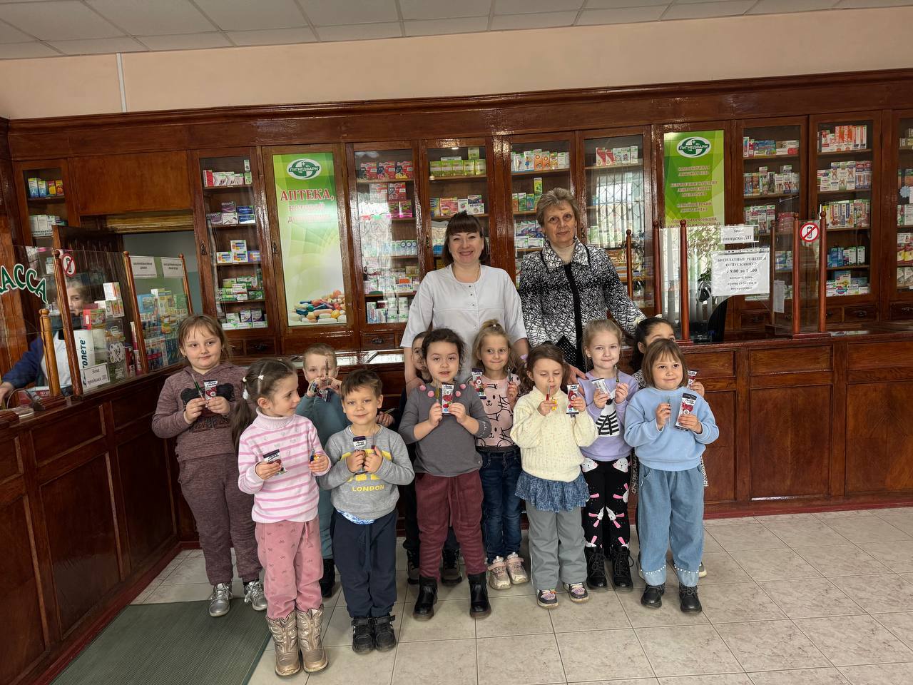 За активность и внимательность каждый ребёнок получил небольшой подарок: леденцы «Петушки» — символ бодрости и хорошего настроения — а также ручки-шприцы и раскраски на тему «Аптека и лекарства», которые помогли закрепить полученные впечатления.
