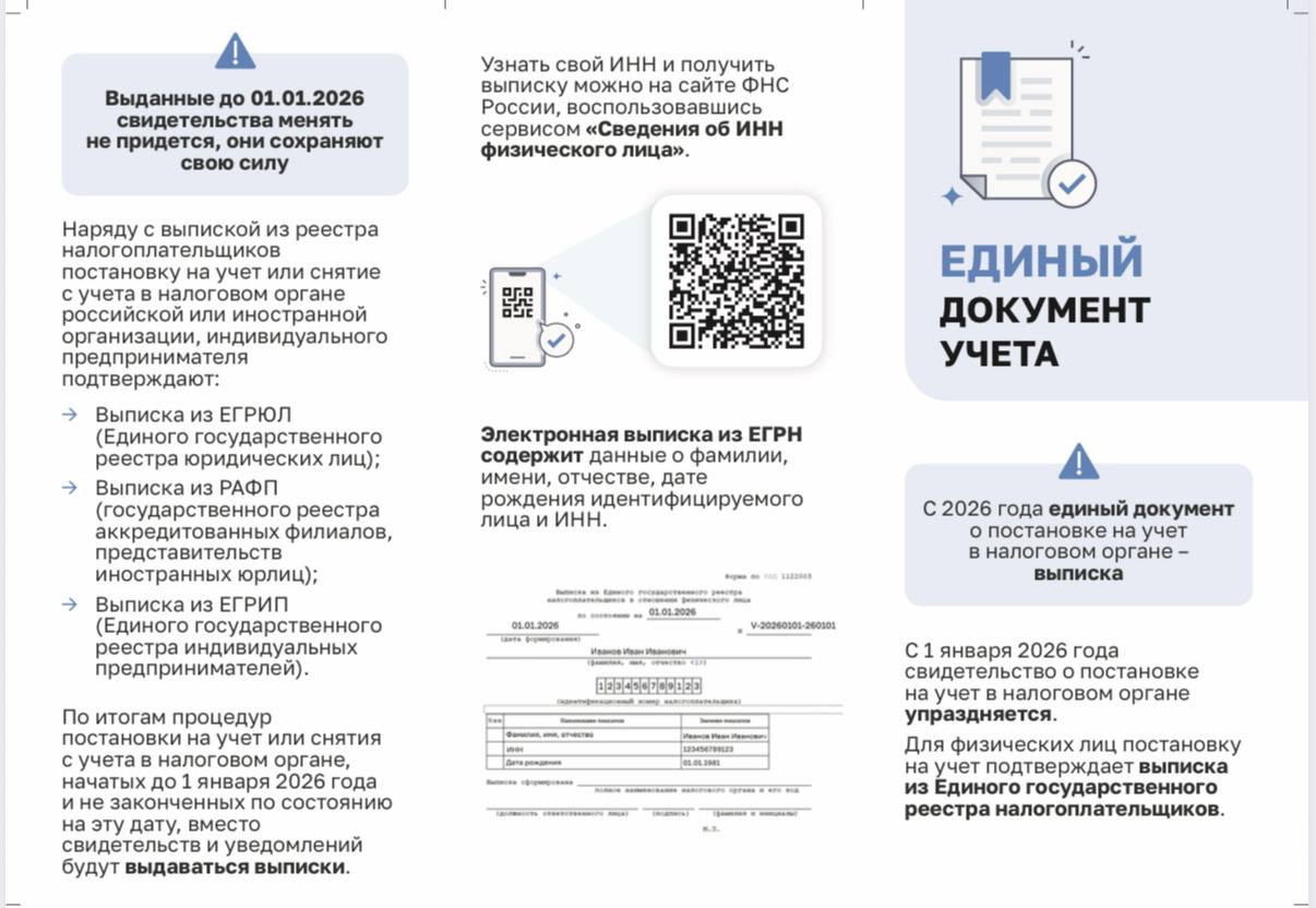 С 1 января 2026 года свидетельство о постановке на учет в налоговом органе упраздняется. Для физических лиц подтверждать постановку на учет будет выписка из ЕГРН (Единого государственного реестра налогоплательщиков). Но выданные ранее свидетельства менять не придется, они сохраняют свою силу.