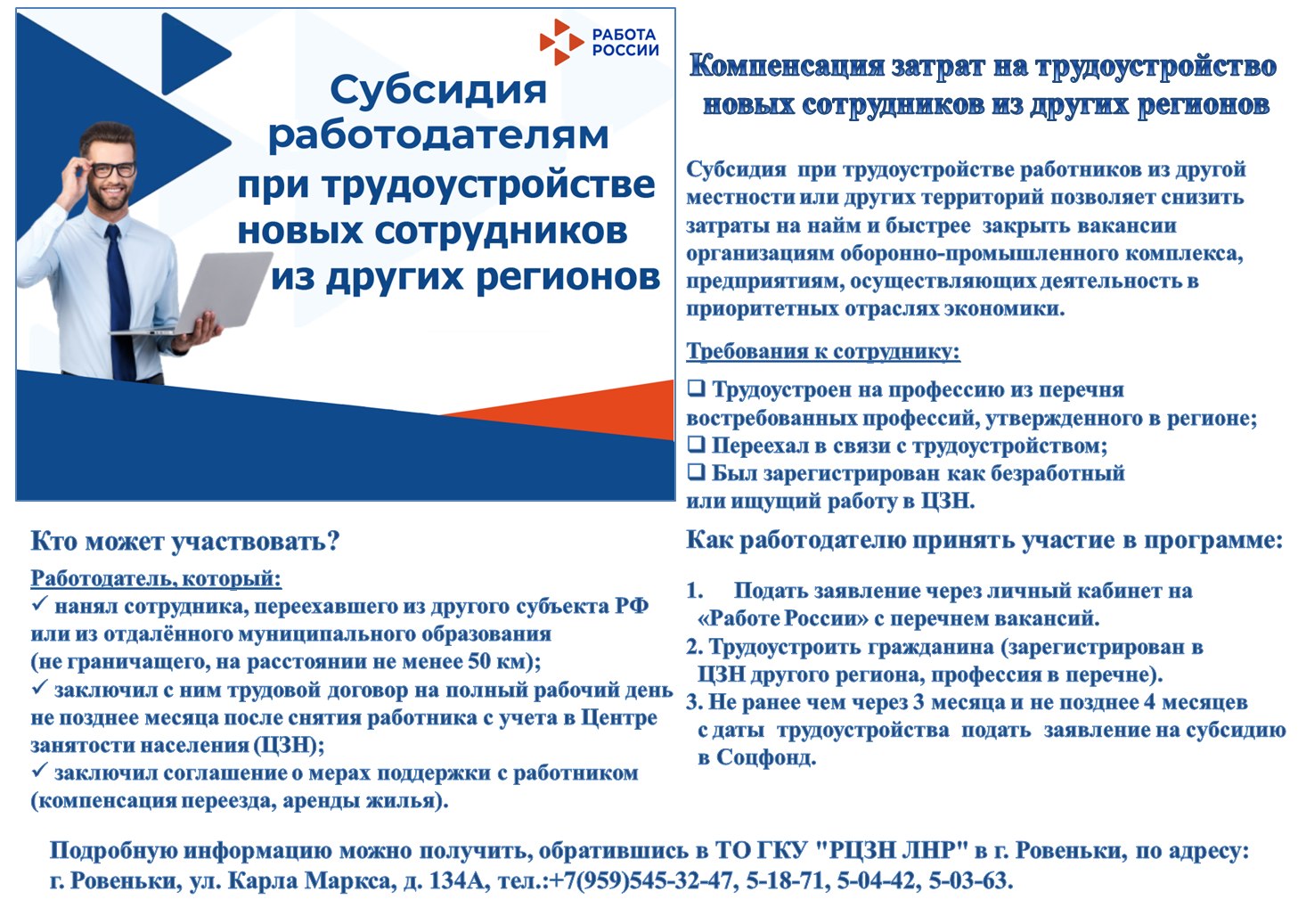 Подробную информацию можно получить, обратившись в ТО ГКУ «РЦЗН ЛНР» в г. Ровеньки, по адресу: г. Ровеньки, ул. Карла Маркса, д. 134А, тел.:+7 (959)545-32-47, 5-18-71, 5-04-42, 5-03-63.