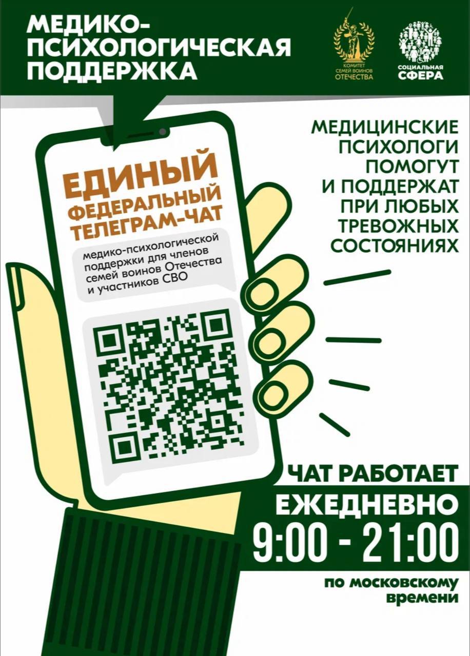 Продолжает свою работу единый федеральный чат Комитета семей воинов Отечества по оказанию медико-психологической поддержки семьям и участникам специальной военной операции (СВО) в круглосуточном режиме.
