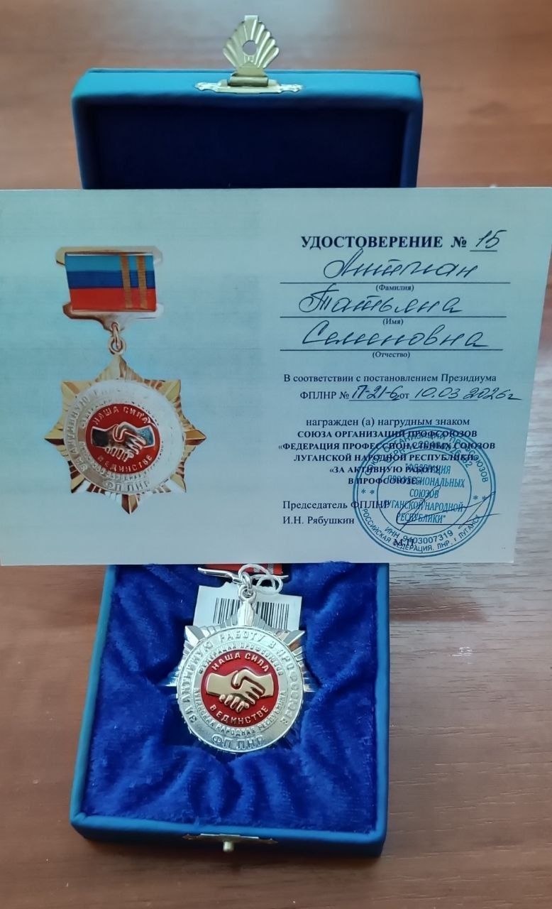 Директору ДК, Татьяне Семёновне Литман, вручил нагрудный знак «За активную работу в профсоюзе» II степени. Председатель Республиканского комитета профсоюза работников культуры Саянова Тамара Ивановна отметила почётными грамотами членов профсоюза за их вклад в развитие культурной сферы. Сотрудники Дворца – это коллектив единомышленников, коллектив талантливых и творческих людей.