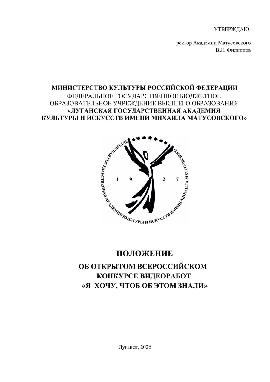 Всероссийский конкурс видеоработ «Я ХОЧУ, ЧТОБ ОБ ЭТОМ ЗНАЛИ», организованный ФГБОУ ВО «Луганская государственная академия культуры и искусств имени Михаила Матусовского», предоставляет уникальную возможность участникам продемонстрировать свои творческие способности и рассказать о значимых аспектах своей малой Родины.