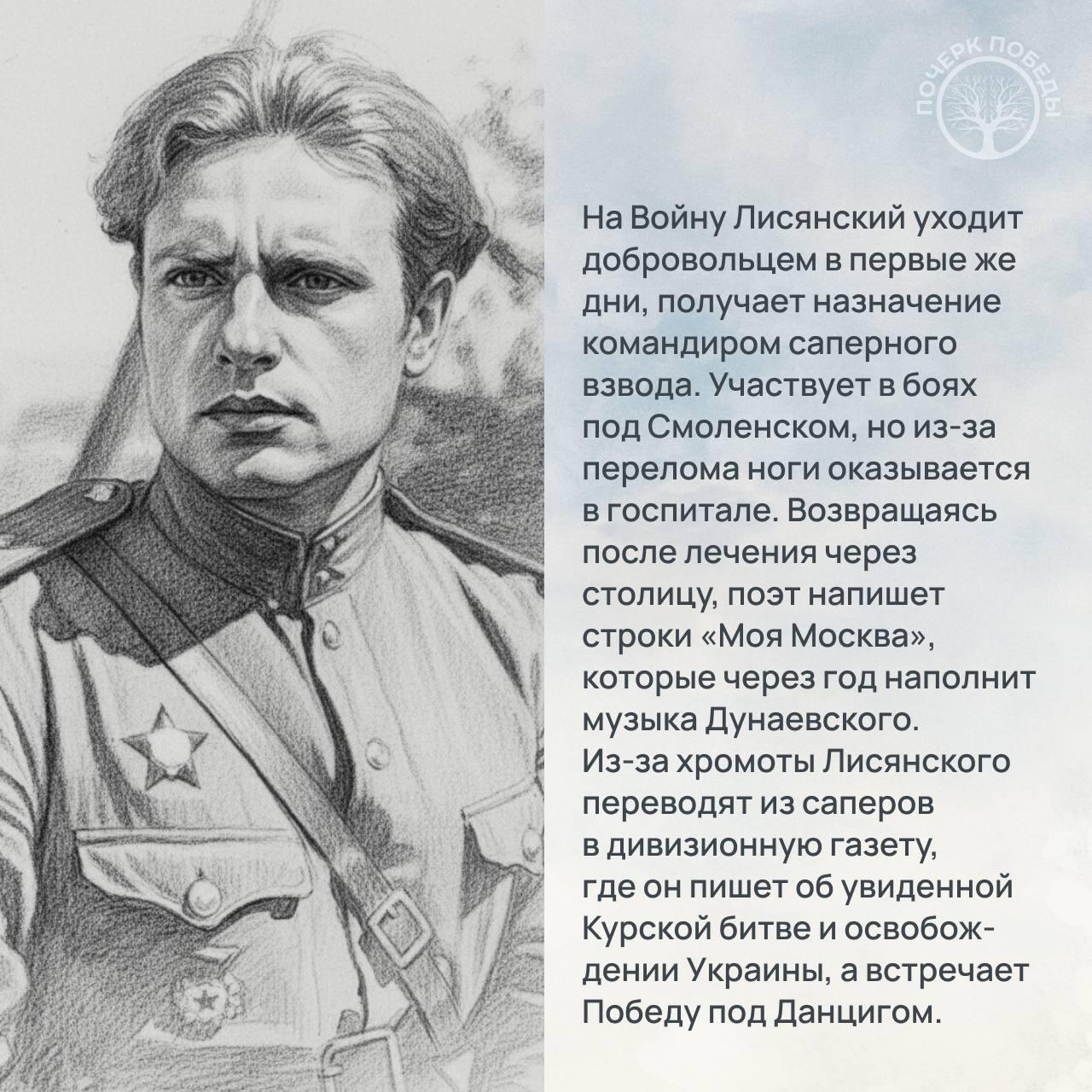 В первые же дни Войны Марк Лисянский записался добровольцем и до тяжелой травмы успел повоевать под Смоленском. Позже его переведут в дивизионную газету, описывая сражения и подвиги солдат он дойдет до Пруссии, где и встретит Победу.