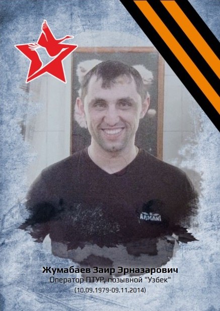 Жумабаев Заир Эрназарович родился 10 сентября 1979 года. В 2014 году, когда началось вооруженное противостояние на Донбассе, Заир встал на защиту Луганской Народной Республики. Он проходил службу оператором ПТУРа в противотанковом взводе батальона «Заря». Его позывной - «Узбек».