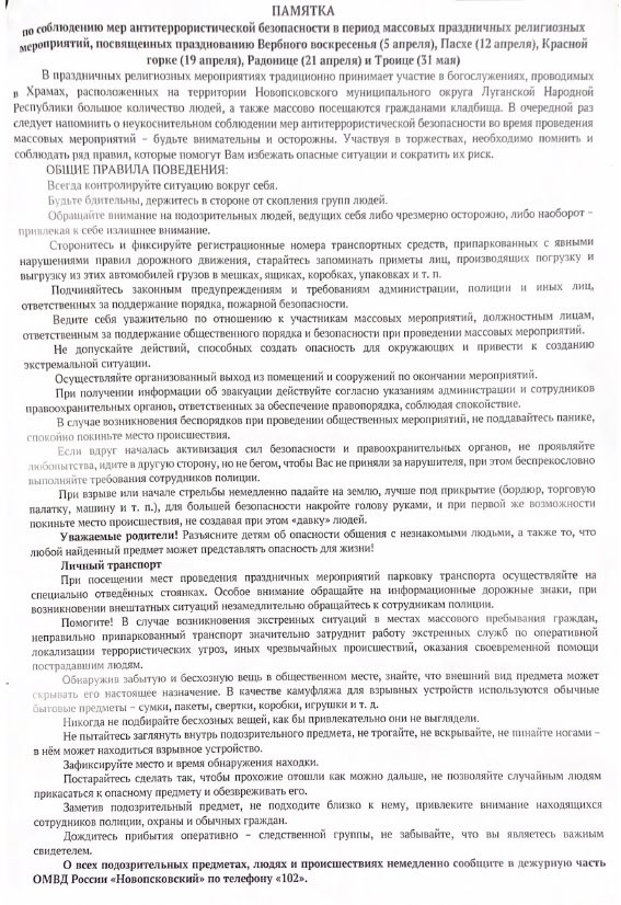 Памятка по соблюдению мер антитеррористической безопасности в период массовых праздничных региональных религиозных мероприятий, посвященных празднованию Вербного воскресенья (5 апреля), Пасхе (12 апреля), Красной горке (19 апреля), Радонице (21 апреля) и Троице (31 мая).