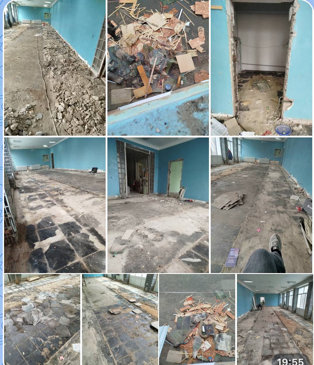 На данный момент уже начались демонтажные работы в помещениях библиотек: демонтаж старого напольного покрытия во всех помещениях, межкомнатных и входных дверей. Далее будут произведены такие ремонтные работы: