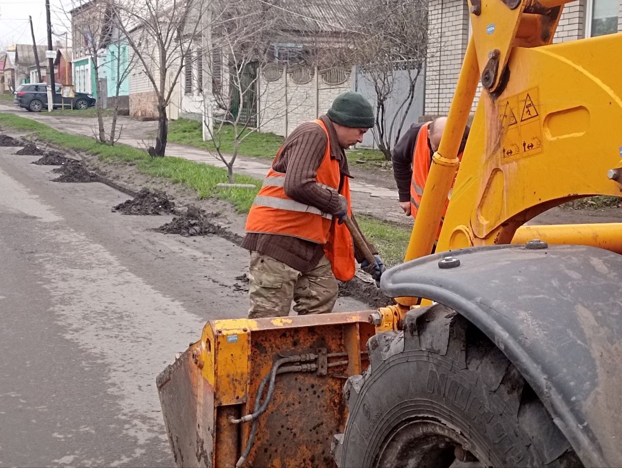 Сегодня специалисты МУП "Скат" выполняют работы по очистке бордюрного камня от наносного грунта на улице Карла Маркса.