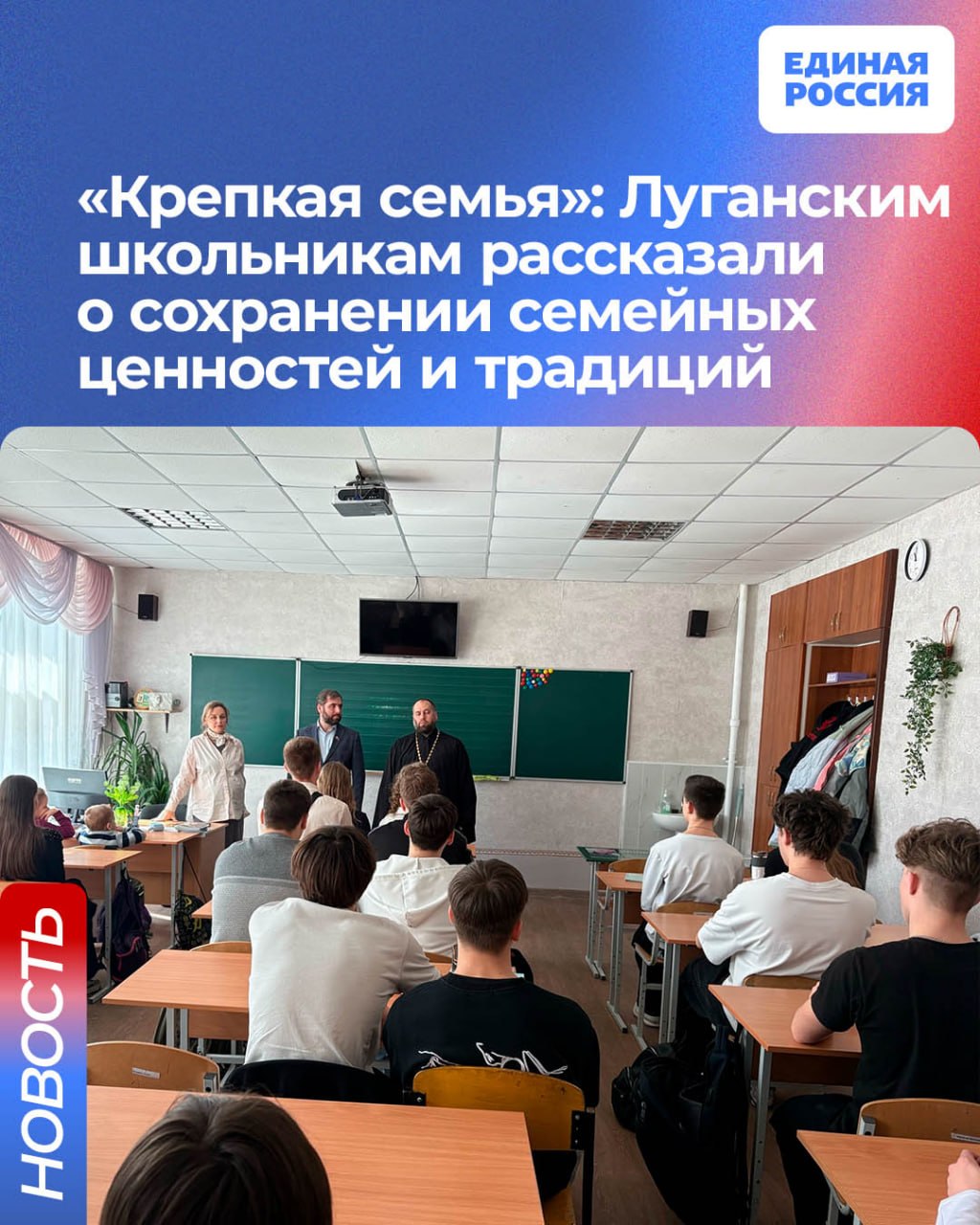 В рамках федерального проекта Единой России «Крепкая семья» в Луганской школе №53 по инициативе духовного наставника школы протоиерея Сергия Цапука состоялась важная встреча старшеклассников с многодетной семьёй: депутатом Народного Совета ЛНР, координатором федерального проекта «Крепкая Семья», отцом шестерых детей Тихоном Гончаровым и его супругой Инной Гончаровой.