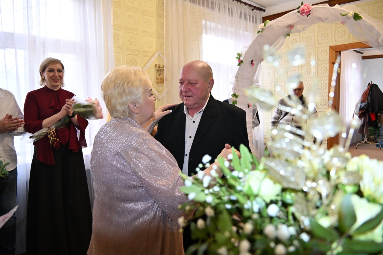 Сегодня, спустя 50 лет, в стенах ЗАГСа собрались родные и близкие юбиляров. Такие же молодые и счастливые «молодожёны» – только теперь рядом с ними взрослые дочери, которыми они по праву гордятся. В торжественной обстановке супруги вновь надели кольца друг другу и станцевали свой первый – теперь уже юбилейный – танец.