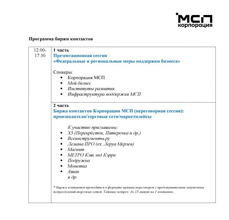 В рамках биржи контактов будут организованы прямые переговоры с профильными специалистами торговых сетей и маркетплейсов, заинтересованных в закупках продовольственных и непродовольственных товаров и услуг.