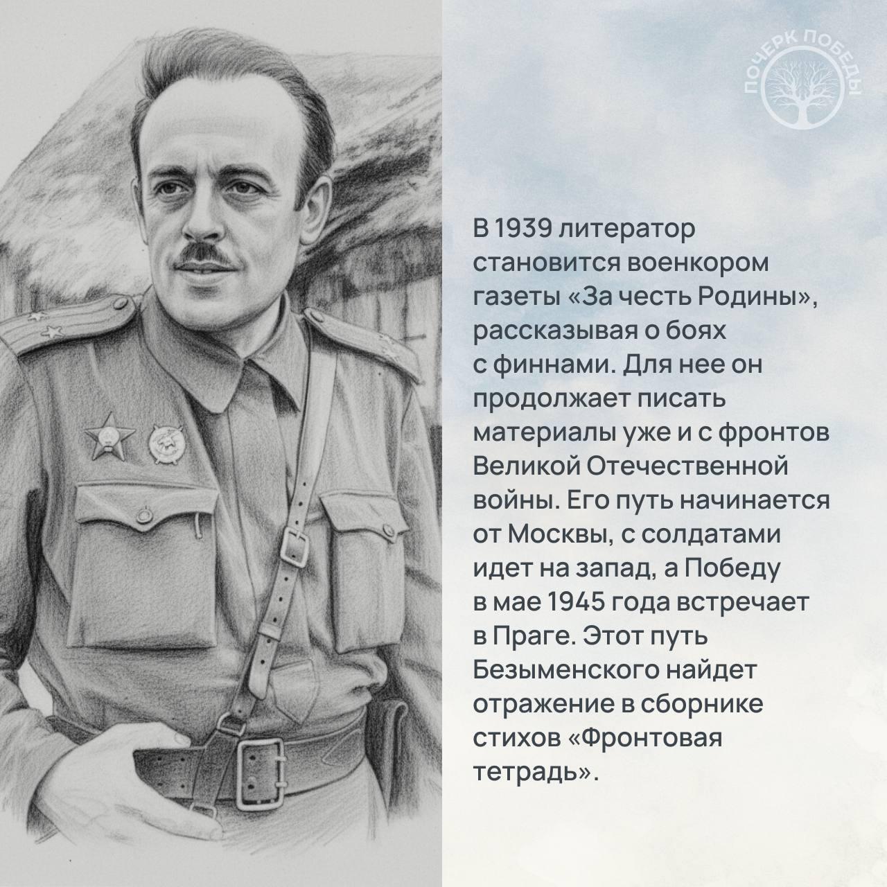 Безыменский впервые пишет материалы с фронта еще в финскую кампанию. В годы Великой Отечественной войны военкором с солдатами он доходит от Москвы до Праги, отразив свои переживания в «Фронтовой тетради».